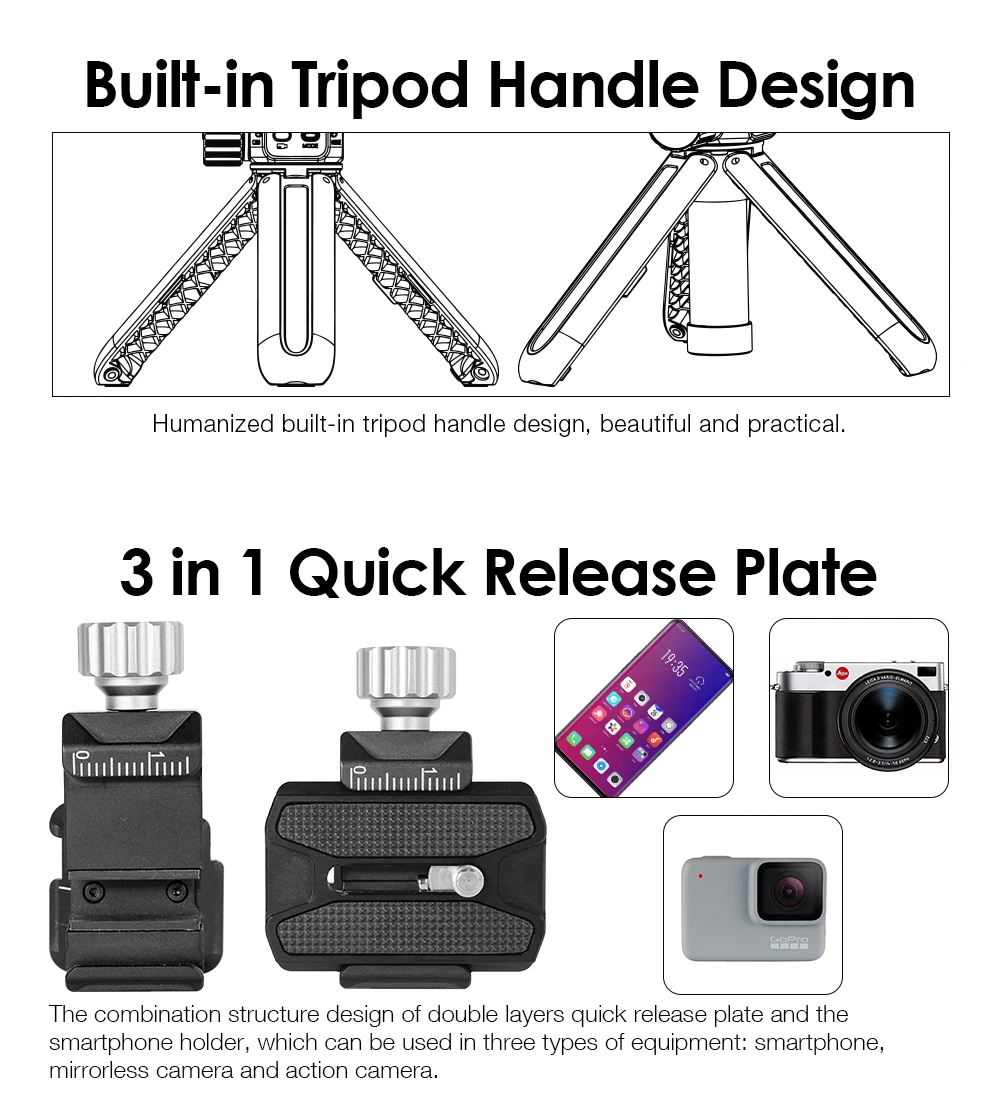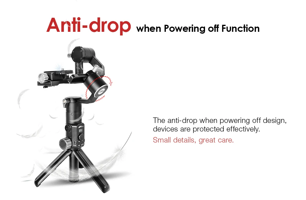●Adopt саморазвивающийся 3 оси стабилизации алгоритм, видео с высокой стабильности. ● Ось качения с наклонной рукояткой, не блокирует винт камеры, удобен для съемки. ● Мобильный/SLR Комплект не требует дополнительных компонентов, удобен для переноски на открытом воздухе. ● Изделие со встроенным штативом, удобно для переноски на открытом воздухе. ● Время работы аккумулятора до 10 часов ● Компактный и легкий, с батареей всего 480 г