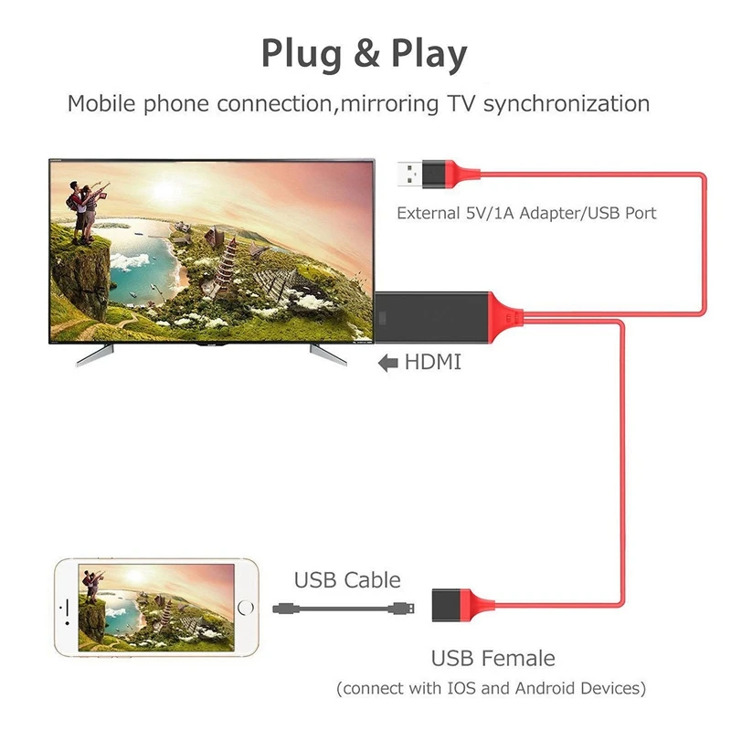 Plug and Play: Подключите разъем HDMI к порту HDMI для телевизора/проектора; Подключите usb-кабель к адаптеру питания (не менее 5 в 1 а); И подключите ваш кабель передачи данных iphone' к одному разъему кабеля и вашему iPhone, тогда экран телефона будет p из опции «доверие», просто нажмите его, а затем подождите, пока он подключается автоматически.