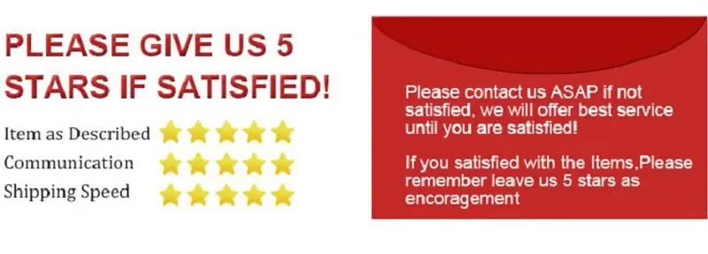 Отзывы: 1. Пожалуйста, оставьте 5 звезд отзывы, если вы удовлетворены нашей продукцией и обслуживанием, Мы будем признательны (товар, как описано 5 звезд, связь 5 звезд, время доставки 5 звезд). 2. Если продукты, которые вы получили, были повреждены или неправильные стили, пожалуйста, не оставляйте отрицательные отзывы, пожалуйста, свяжитесь с нами, мы разберемся с этим и разработаем лучшие решения, ваше удовлетворение-это наше движение, чтобы сделать лучше. Политика доставки и возврата: 1. Мы обычно осуществляем заказы в течение 24 часов после получения оплаты. 2. Почта Китая обычными малыми пакетами плюс и Почта Китая, зарегистрированная Авиапочта занимает 15-60 дней. 3. Рекомендуемые поставки: Aliexpress Стандартная доставка-более стабильная, безопасная, быстрая. 4. Мы также предлагаем Экспресс-доставку, такие как DHL, UPS, EMS и т. д., пожалуйста, не стесняйтесь связаться с нами, если вы срочно нуждаетесь в нем или количество велико.