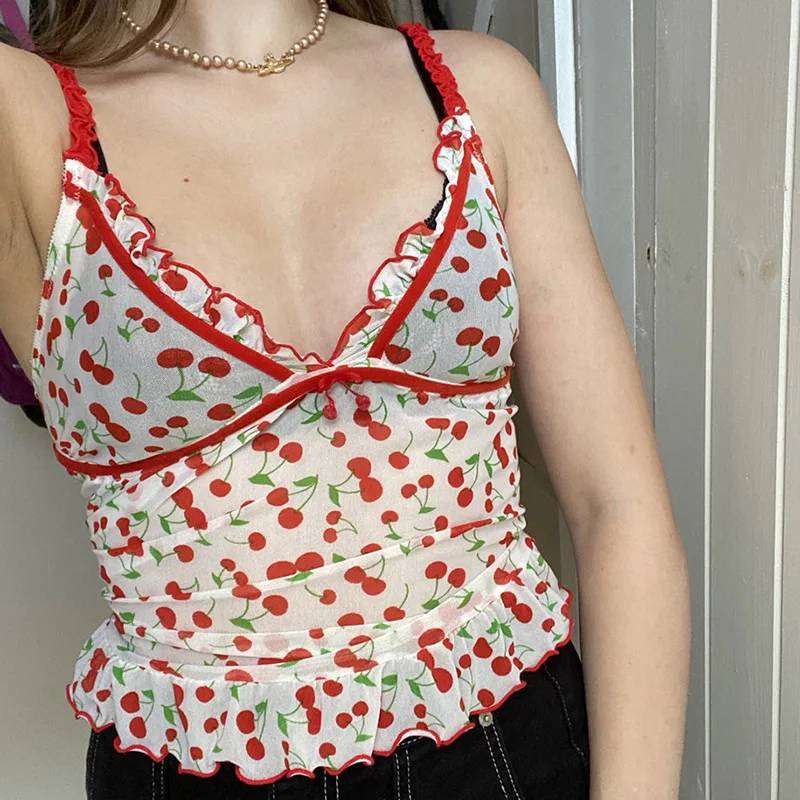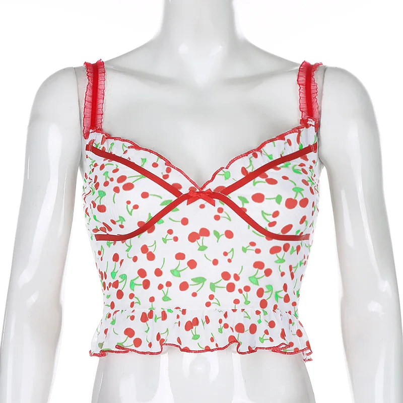 Новинка женские короткие топы, милая летняя футболка LUZUZI y2k без рукавов с бантом и вишневым принтом, эстетический топ с рюшами, сексуальная облегающая кофта 90-х