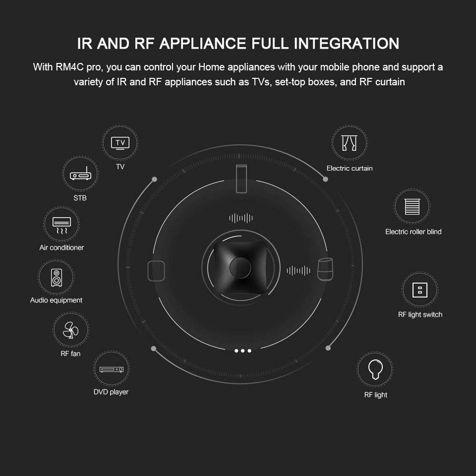 Совместим с dispositivos IR y RF para su control mediante tu smartphone o asistentes de voz. Amplia variedad de configuraciones, temporizadores, cuenta atras, .. Para adaptarse a tu vida Con RM4-PRO puedes integrar diferentes electrodomésticos que utilicen mandos a distancia IR o RF en tu teléfono móvil.