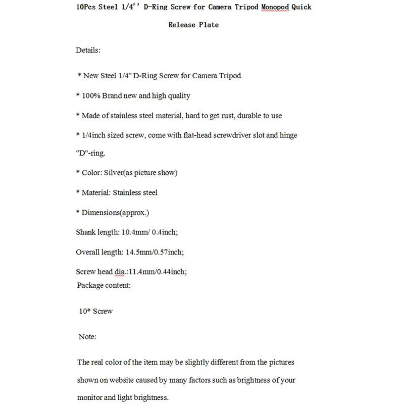 Особенности: Цвет: серебристый Материал: нержавеющая сталь Длина вала: прибл. 10,4 мм/0,4 дюйма Длина (включая основание): прибл. 14,5 мм/0,57 дюйма Диаметр головки винта: 11,4 мм/0,44 дюйма Диаметр головки d-кольца: 16 мм/0,63 дюйма (прибл.) Прецизионный винт штатива из нержавеющей стали 1/4 дюйма Описание: 1. Новый стальной 1/4 ''d-кольцевой винт для штатива камеры 2.100% новый и высокое качество 3. Изготовлен из нержавеющей стали, трудно получить ржавчину, прочный в использовании 4,1/4-Дюймовый Винт размера, поставляется с плоской головкой отвертки слот и шарнир "D"-кольцо. Содержимое упаковки: 10 шт./компл. винт Примечание: Реальный цвет товара может немного отличаться от изображения на веб-сайте, вызванного многими факторами, такими как яркость вашего монитора и яркость света.