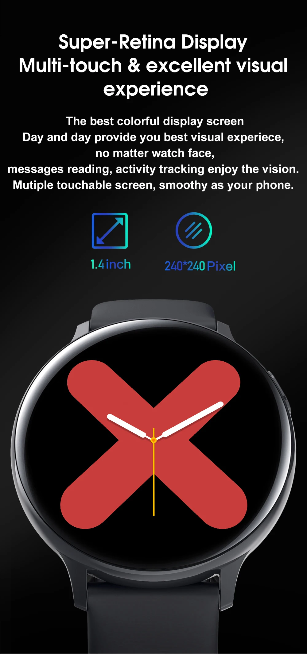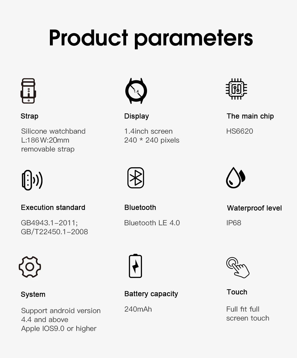 Платформа: Hunterson HS6620 RAM: 128KB, ROM: 512KB + 128MB Размер: 44*44*12 мм, с ремешком 230 мм Корпус: чехол из сплава, алюминиевый ободок, пластиковый задний Чехол Зарядка: магнитное зарядное устройство, 2 часа для полной зарядки