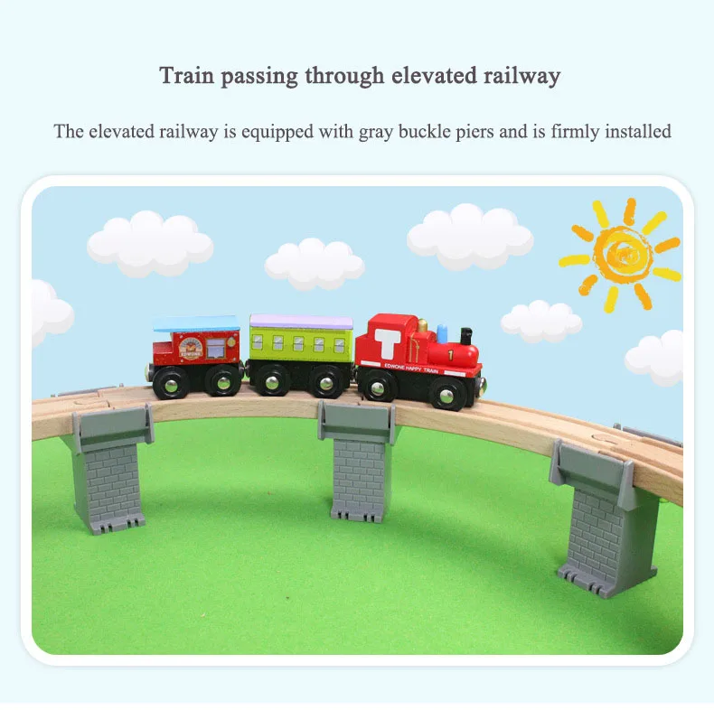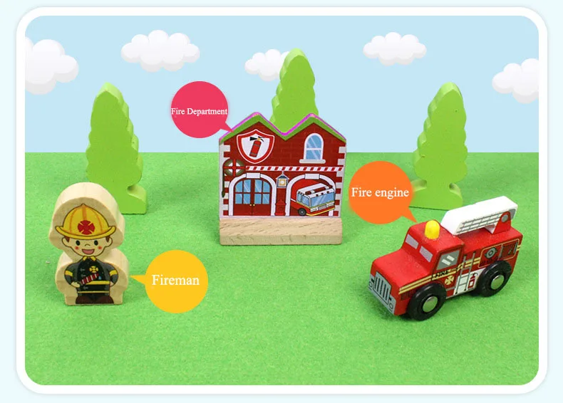 The toy consists of 70 pieces of wooden track and related accessories, including 23 pieces of track, related accessories including wooden locomotives and carriages (front and rear magnets can be connected), loading and unloading trailers, ambulances, police cars, various traffic signs, various occupational figures (firefighters, doctors, police, workers, etc),various buildings (Red Bridge - Atmosphere, Viaduct, Station - Super Large, Apron - with a command tower, a snack bar, a gas station, a merchant,