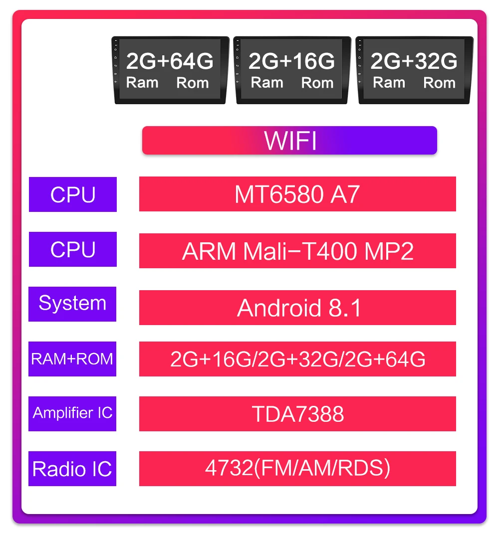 Процессор: MT6580 A7 Графический процессор: ARM Mali-T400 MP2 RAM + ROM: 2 + 16G/2G + 32G/2G + 64G Процессор: 4-ядерный процессор со скоростью одного ядра до 1,3 ГГц Разрешение экрана: 1024*600 Усилитель IC: TDA7388 Радио IC: 4732 (FM/AM/RDS) Не поддерживает видеовыход Функция Bluetooth: телефон с громкой связью (HFP), музыка Bluetooth (A2DP), синхронизация телефонной книги и истории вызовов Встроенные приложения: Google Maps, Play Store, APK Pure, YouTube Язык: китайский/традиционный китайский/английский/Болгария/Корейский/арабский/испанский/португальский/русский/ Вьетнам/Иврит/Польша/Индонезия/Румыния/тайский/Тагальский/Украина Сигнал камеры: CVBS, AHD 720P, TVI, CVI, PVI, AHD 1080P Управление рулевым колесом: клавиша 1/клавиша 2 Рабочая температура: -20 °C ~ 70 °C Температура хранения: -40 °C ~ 85 °C Диапазон рабочего напряжения: постоянный ток 9,6 В ~ 16 В Ток в режиме ожидания всей машины: Выкл. АКС: ≤ 5 мА Зарядка через USB-выход: зарядный ток до 1.0A (выход 5V, 1.0A)