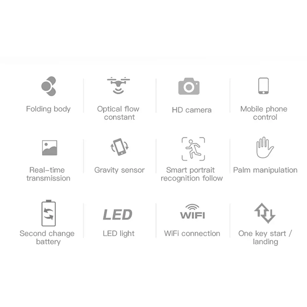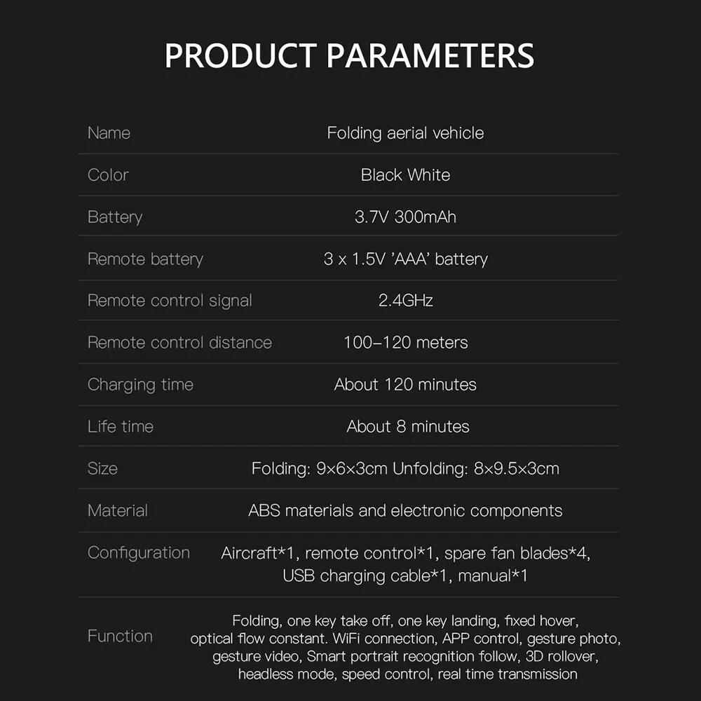 Функция: Приложение управления полетом, 100-Расстояние полета метра,Удержание высотыРежим,Режим полёта Waypoint, фото/видео жестов, креативное видео, Безголовый режим, фиксированное hover,Светодиодная лампа,3-уровневая регулировка скорости полета, один ключ Взлет/посадка, один ключ возврата
