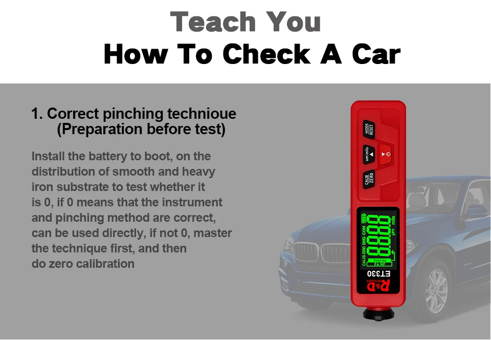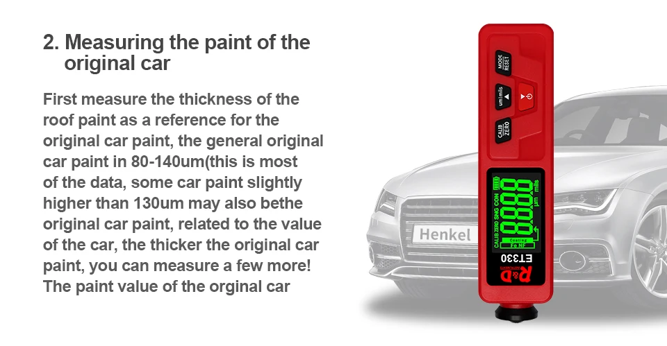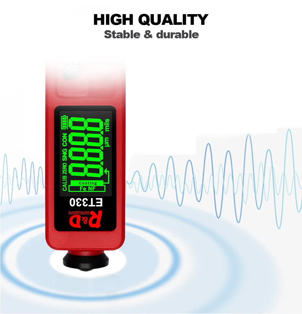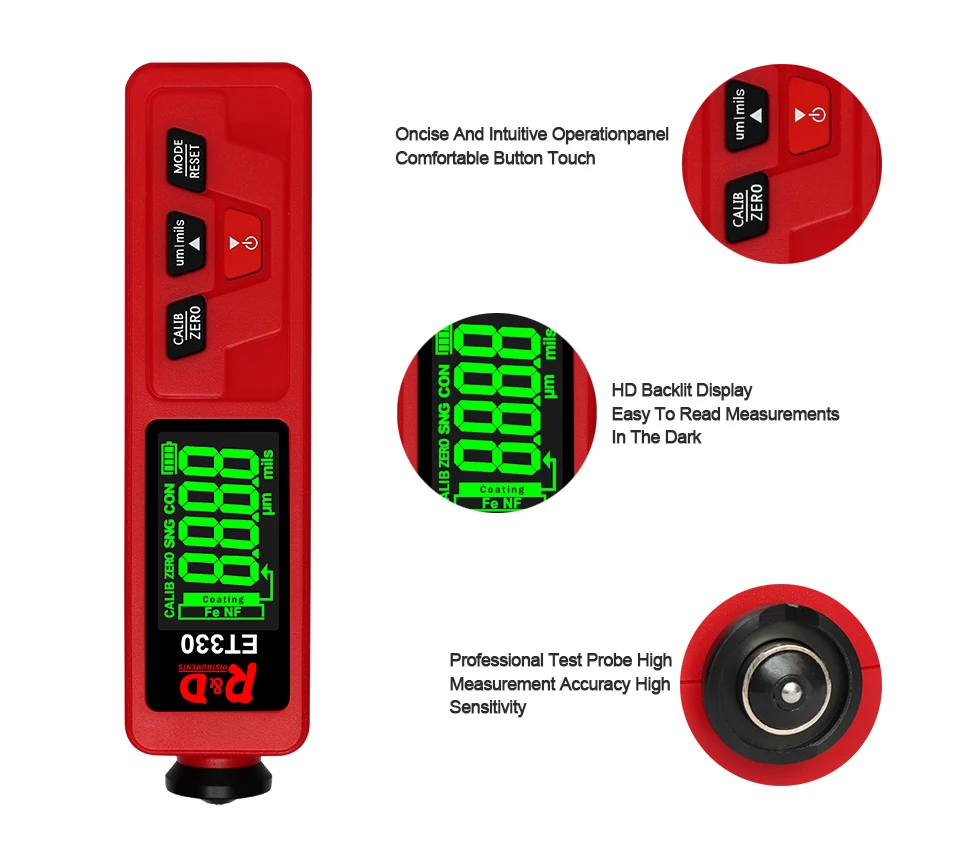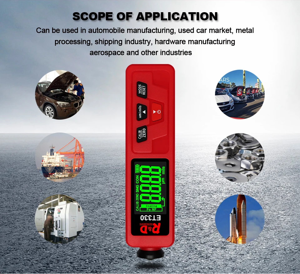 ET330 автомобильный измеритель толщины краски цифровой ЖК-дисплей с подсветкой тестер толщины покрытия толщиномер с русским/английским руководством Батарейки (2 шт., 1,5 В, AAA) не поставляются с посылка. Введение: Толщиномер используется для измерения толщины покрытого и покрытого листа на металле, например, краска/эмаль/хром на стали, краска и анодированное покрытие на алюминии/меди. Датчик принимает точный интегрированный зонд и использует принципы электромагнитной индукции и эффекта вихревого тока, который автоматически определяет атрибут подложек. Область применения: Датчик предназначен для неразрушающего измерения толщины покрытия и окраски. Это важно для обработки поверхности материала и широко используется в обрабатывающей промышленности, металлургической промышленности, химической промышленности, области инспекции товаров, а также может работать стабильно в лаборатории, мастерской и на открытом воздухе.