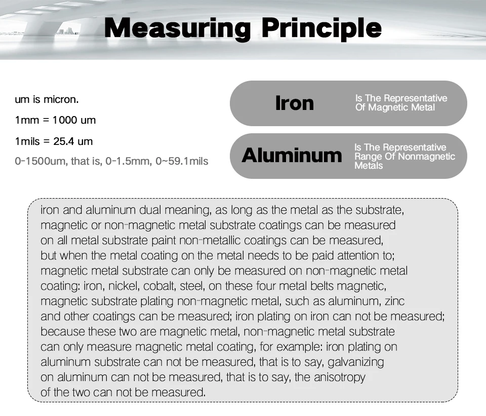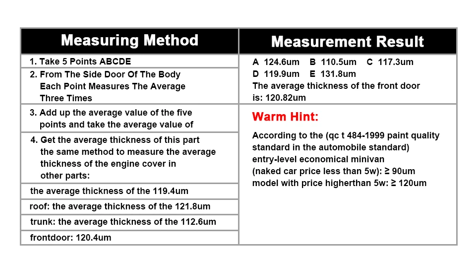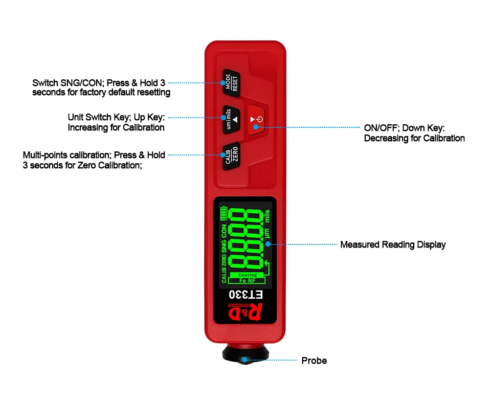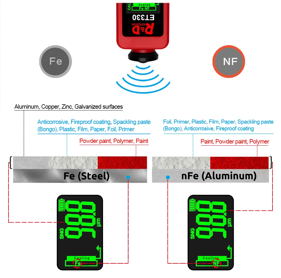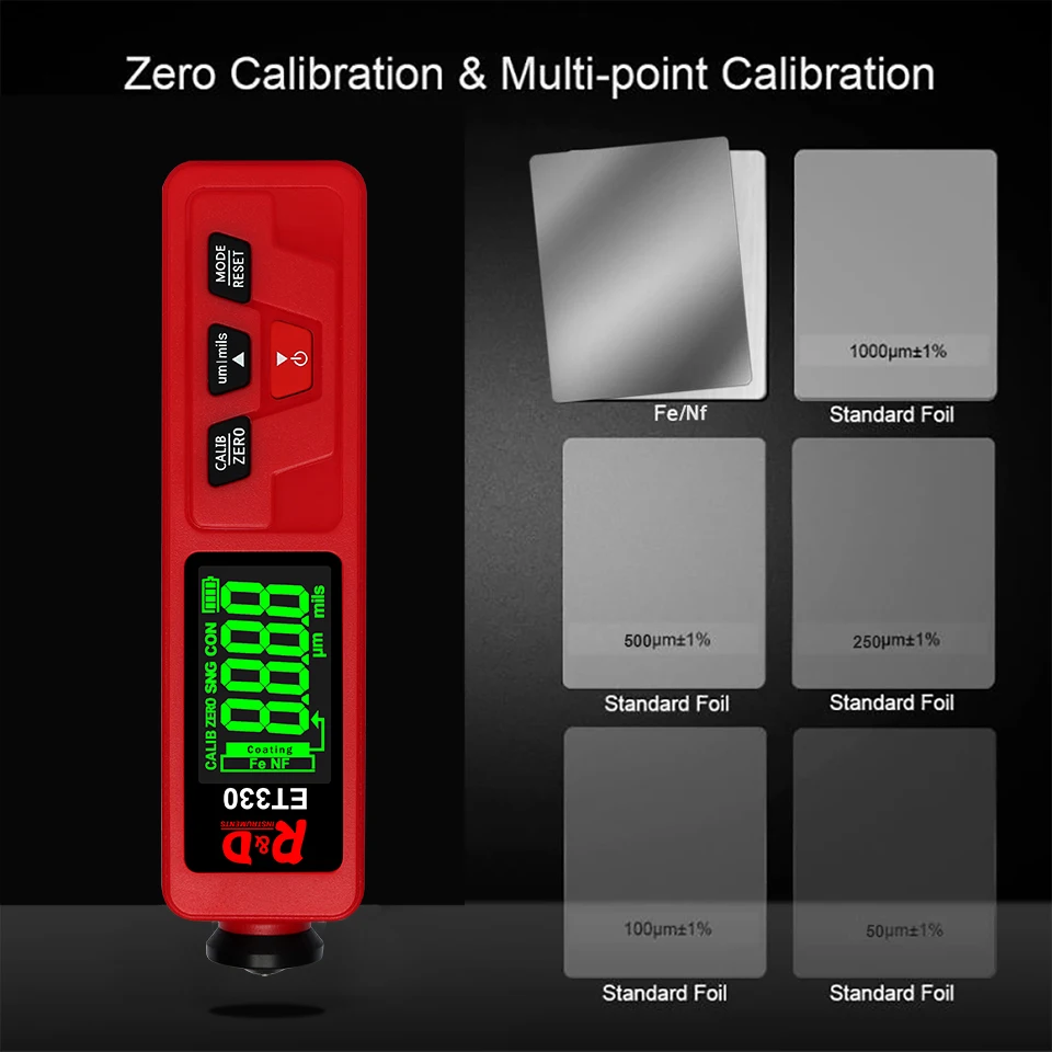 ET330 автомобильный измеритель толщины краски цифровой ЖК-дисплей с подсветкой тестер толщины покрытия толщиномер с русским/английским руководством Батарейки (2 шт., 1,5 В, AAA) не поставляются с посылка. Введение: Толщиномер используется для измерения толщины покрытого и покрытого листа на металле, например, краска/эмаль/хром на стали, краска и анодированное покрытие на алюминии/меди. Датчик принимает точный интегрированный зонд и использует принципы электромагнитной индукции и эффекта вихревого тока, который автоматически определяет атрибут подложек. Область применения: Датчик предназначен для неразрушающего измерения толщины покрытия и окраски. Это важно для обработки поверхности материала и широко используется в обрабатывающей промышленности, металлургической промышленности, химической промышленности, области инспекции товаров, а также может работать стабильно в лаборатории, мастерской и на открытом воздухе.