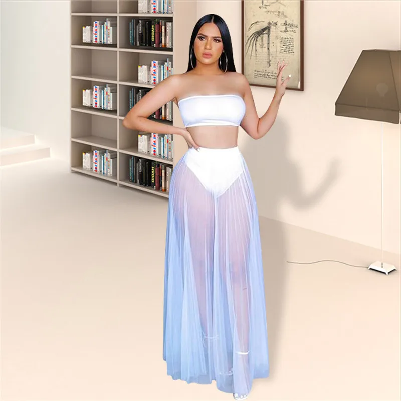 Adogirl/Новинка 2020 года; комплект из двух предметов с прозрачной сеткой; платье без бретелек; укороченный Топ без бретелек; юбка макси с трусиками; летняя пляжная одежда; Клубные наряды