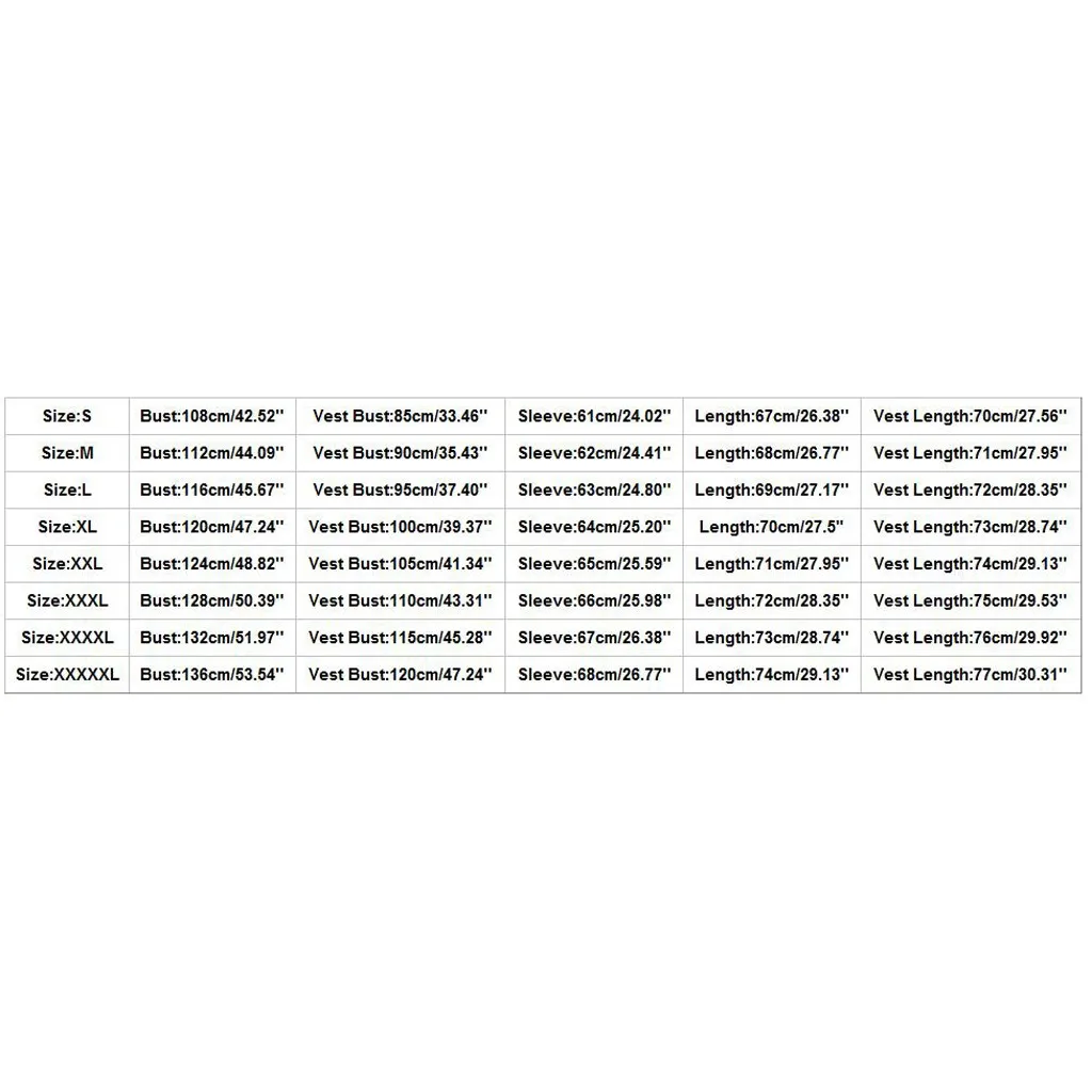 Размеры Бюст Жилет бюст Рукав Длина Длина жилета S 108 см/42,52 дюйма 85 см/33,46 дюйма 61 см/24,02 дюйма 67 см/26,38 дюйма 70 см/27,56 дюйма М 112 см/44,09 дюйма 90 см/35,43 дюйма 62 см/24,41 дюйма 68 см/26,77 дюйма 71 см/27,95 дюйма L 116 см/45,67 дюйма 95 см/37,40 дюйма 63 см/24,80 дюйма 69 см/27,17 дюйма 72 см/28,35 дюйма XL 120 см/47,24 дюйма 100 см/39,37 дюйма 64 см/25,20 дюйма 70 см/27,5 дюйма 73 см/28,74 дюйма XXL 124 см/48,82 дюйма 105 см/41,34 дюйма 65 см/25,59 дюйма 71 см/27,95 дюйма 74 см/29,13 дюйма XХХL 128 см/50,39 дюйма 110 см/43,31 дюйма 66 см/25,98 дюйма 72 см/28,35 дюйма 75 см/29,53 дюйма XXXXL 132 см/51,97 дюйма 115 см/45,28 дюйма 67 см/26,38 дюйма 73 см/28,74 дюйма 76 см/29,92 дюйма XXXXXL 136 см/53,54 дюйма 120 см/47,24 дюйма 68 см/26,77 дюйма 74 см/29,13 дюйма 77 см/30,31 дюйма
