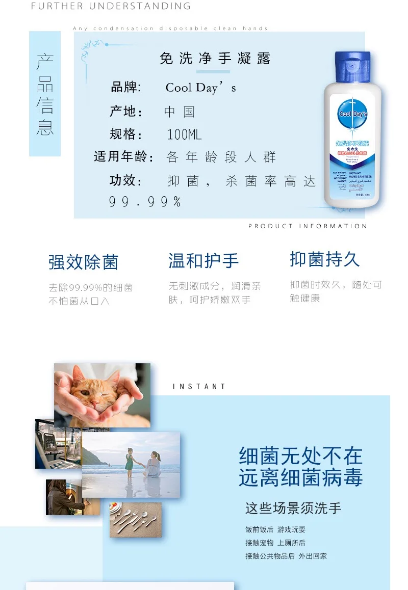 50 мл дезинфицирующее средство для рук медицинская Бытовая дезинфекция антибактериальное увлажняющее одноразовое дезинфицирующее средство для рук Характеристики: Содержание нетто: 50 мл, Способ использования: Возьмите соответствующее количество (2-3 мл) продукта, чтобы увлажнить руки и втереть в течение 15 секунд, пока жидкость не закроет руки, подождите, пока высыхнет, И не стирать с водой. Функция: эффективно устраняет большинство патогенных микроорганизмов, таких как E. coli, Staphylococcus aureus и т. д. 1. Может эффективно и быстро убивать микробы, грибы, коцки, вирусы и т. Д. 2. Мягкое и не раздражающее, не повреждает кожу, обладает функцией удержания воды и увлажнения 3. Не стирать с водой, легко экономить воду 4. Маленький размер, легко носить с собой 5. Гелевая текстура, вы можете легко контролировать количество Ингредиенты продукта: дихлорбензиловый спирт, этанол, вода, пропиленгликоль, глицерин, Примечание: Этот продукт предназначен для внешнего использования. Не принимайте его внутри. Используйте с осторожностью для людей с аллергией на алкоголь. Пожалуйста, держите его в недоступном для детей месте. Использование Дезинфицирующее средство для рук помогает уменьшить бактерии на коже, которые могут вызвать болезни Рекомендуется для повторного использования Предупреждения Легковоспламеняющийся. Держите подальше от огня или пламени Только для внешнего использования При использовании этого продукта не используйте в глаза или рядом с ними. В случае контакта, смоляные глаза тщательно с водой Прекратите использование и обратитесь к врачу, если появляется раздражение или сыпь и длится Хранить в недоступном для детей месте. При проглатывании немедленно обратитесь в центр контроля яда. Указания Поместите достаточно товара на ладонь, чтобы полностью закрыть руки Быстро трите руки до высыхания Дети в возрасте до 6 лет должны контролироваться при использовании дезинфицирующего средства для рук