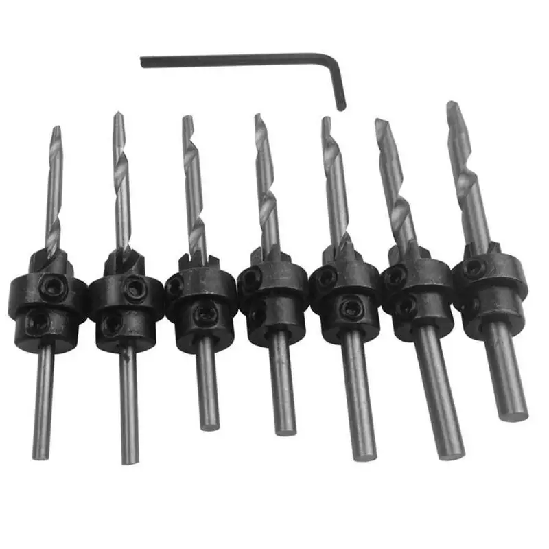 Включает в себя 7 конических сверл, 7 потайных раковин, 7 регулируемых стоп-Ошейников плюс шестигранный ключ.