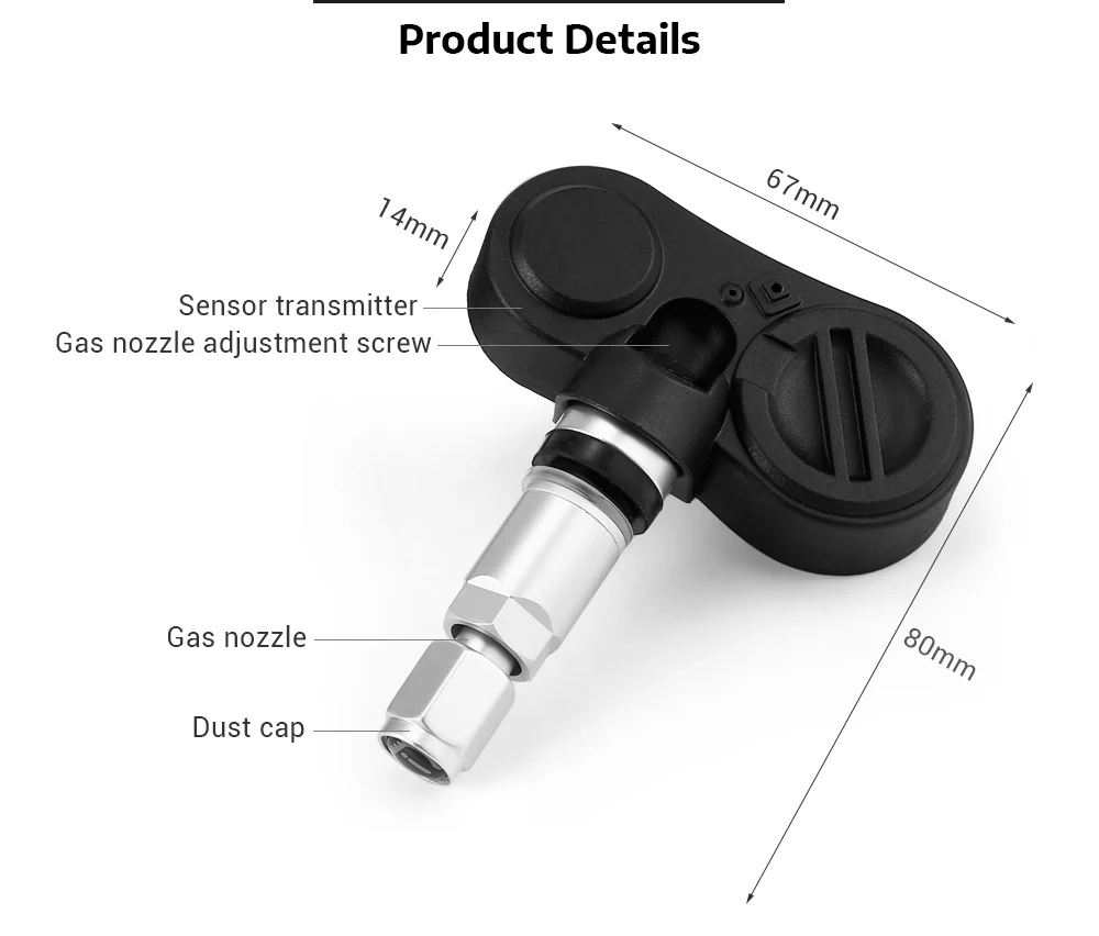 Основные характеристики: -Надежный и простой в установке -Датчики внутреннего клапана, регулируемый угол крепления датчика, водонепроницаемость -Сменный кнопочный элемент, CR2450, 3В, 500мА -Длительный срок службы батареи, около 5 лет, вы можете заменить батарею автономно, не нужно возвращать производителям Характеристики: -Диапазон давления: 0-4,5 бар (0-65,25 psi) -Рабочая частота: 433,92 МГц (+/-20 кГц) -Мощность передачи: более 8 дБм -Режим передачи: FSK -Рабочее напряжение: 2-3,6 В -Ток в режиме ожидания: менее 1 UA -Рабочая температура:-20-85 градусов по Цельсию Тип: Внутренний Размеры и вес Вес изделия: 0,0640 кг Вес упаковки: 0,0680 кг Размер упаковки (Д x Ш x В): 14,00x5,20x3,90 см/5,51x2,05x1,54 дюймов Содержимое упаковки Комплектация: 1 внутренний датчик, 1 винт