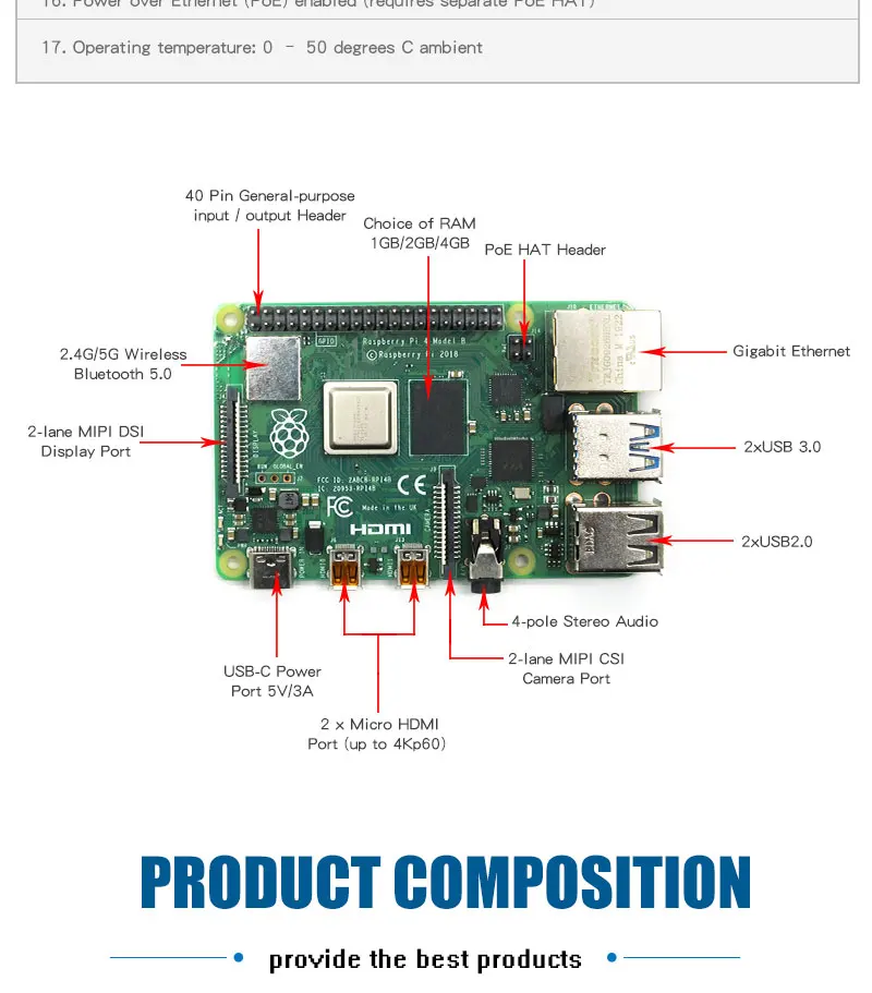 Введение: Raspberry Pi 4 Model B-это новейший продукт в популярном диапазоне компьютеров Raspberry Pi. Он обеспечивает наземное увеличение скорости процессора, мультимедийной производительности, памяти и подключения по сравнению с предыдущими поколениями Raspberry Pi 3 Model B +, сохраняя обратную совместимость и аналогичное энергопотребление. Для конечного пользователя Raspberry Pi 4 Model B обеспечивает производительность рабочего стола, сопоставимую с системами ПК начального уровня x86. Этот продукт для основные функции включают в себя высокопроизводительный 64-разрядный четырехъядерный процессор, двухдиапазонный, Wi-светодиодного табло с разрешением до 4K через пару микро-HDMI порты, аппаратное декодирование видео со скоростью до 4Kp60, до 4 Гб Оперативная память, двухдиапазонный, Wi-2,4/5,0 ГГц беспроводной локальной сети, Bluetooth 5,0, Gigabit Ethernet, USB 3,0, и PoE возможности (С помощью отдельной надстройки PoE HAT). Двухдиапазонная Беспроводная LAN и Bluetooth имеют модульную сертификацию соответствия Спецификация: Процессор: Broadcom BCM2711, четырехъядерный процессор Cortex-A72 (ARM v8), 64-разрядная SoC @ 1,5 ГГц Память: 1 Гб, 2 Гб или 4 Гб LPDDR4 (в зависимости от модели) Подключение: 2,4 ГГц и 5,0 ГГц IEEE 802.11b/g/n/ac беспроводной доступ в Интернет, Bluetooth 5,0, BLE Gigabit Ethernet 2 × порты USB 3,0 2 × порта USB 2,0. GPIO: Стандартный 40-контактный GPIO header (Полностью обратная совместимость с предыдущими платами) Видео и звук: 2 × порты micro HDMI (поддержка до 4Kp60) 2-lane MIPI DSI порт дисплея 2-lane MIPI CSI камера порт 4-полюсный стерео аудио и композитный видеопорт Мультимедиа: H.265 (декодирование 4Kp60); H.264 (декодирование 1080p60, кодирование 1080p30); OpenGL ES, 3,0 графика Поддержка sd-карты: Слот карты Micro SD для загрузки операционной системы и хранения данных Входная мощность: 5 в постоянного тока через USB-C разъем (минимум 3A 1) 5 в постоянного тока через GPIO header (минимум 3A 1) Включение питания через Ethernet (PoE) (Требуется отдельная шляпа PoE) Окружающая среда: Рабочая температура 0-50 °C Выберите комплект: