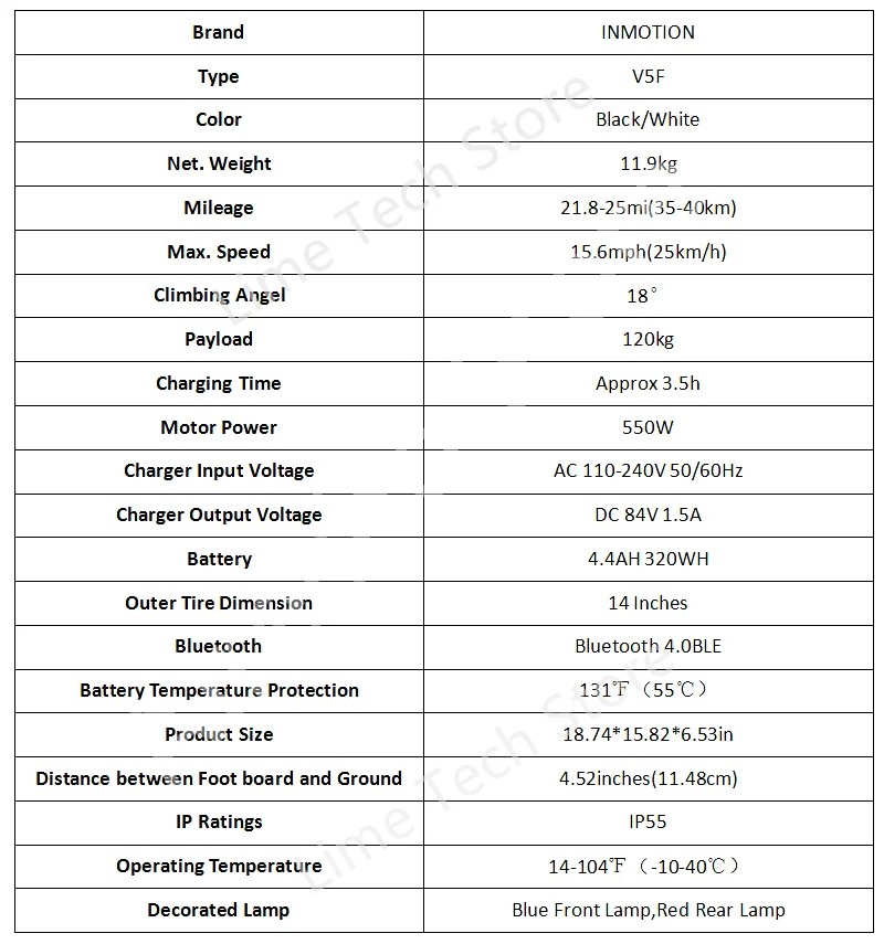 Тип: V5F Цвет: черный/белый Вес нетто: 11,9 кг Mi leage: 21,8-25 mi (35-40 km) Макс. Скорость: 15,6 миль в час) или (25 км/ч) Угол скалолазания: 18 градусов Полезная нагрузка: 120 кг Время зарядки: около 3,5 h Мощность двигателя: 550 Вт Зарядное устройство Вход Напряжение: AC 110-240V 50/60Hz Выходное напряжение зарядного устройства: 84 В постоянного тока * 1,5a Аккумулятор: 4.4AH 320WH Размер внешней шины: 14 дюймов Bluetooth : Bluetooth 4,0 BLE Защита от температуры батареи: 55 градусов Размер изделия: 18,74*15,82*6,53 дюймов Расстояние между стелькой и землей: 4,52 дюйма (11,48 см) Ip-рейтинг: IP55 Рабочая температура: -10-40 градусов Декорированная лампа: синяя передняя лампа, красная задняя лампа