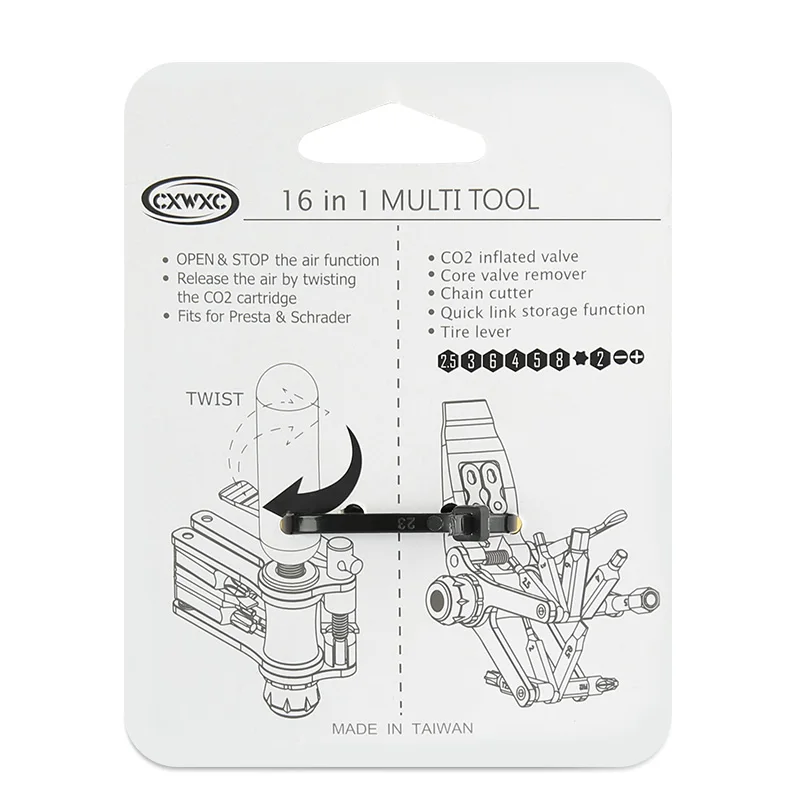 [16 в 1 инструмент для ремонта велосипедов]: особенности 2, 2,5, 3, 4, 5, 6 и 8 мм шестигранные ключи, Torx T25, отвертка flathead, отвертка Phillip, цепной выключатель, инструмент с сердечником клапана presta, 2 рычага для шин, устройство для хранения звеньев цепи и адаптер картриджа CO2
