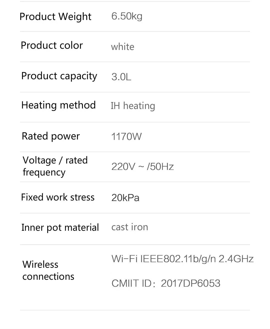 IH нагрев, электромагнитная реакция через медную катушку и Железный распылитель, пусть внутреннее тепло, верхнее отопление и изоляционная доска помогают, приготовление пищи более экономит время Верхняя крышка oled-экрана, отображает больше информации, позволяет вам быть в курсе состояния приготовления, информации о бронировании, контроля времени и т. Д. Соленоидный клапан используется для контроля давления в горшке для повышения температуры кипения воды. Питание Риса полностью выпущено, и Потребляемый рис более сладкий Внутренний Бак изготовлен из серого чугуна с высокой стабильностью, сильной магнитной проницаемостью и хорошей теплоемкостью, что делает еду более равномерно нагреваемой PFA порошковое покрытие, антипригарная сковорода, легко моется, без проблем с уборкой Можно также тушить ребрышки, пирожные, тушеные, можно удовлетворить потребности домашней кухни Спецификация: Бренд Mijia Размер продукта 300*251*212 мм Внутренний материал чугуна Цвет белый Вес 6,5 кг Размер 30x25,1x21,20 см/11,81x9,88x8,35 дюймов Емкость 3л Напряжение 220В/50Гц Номинальная мощность 1170 Вт Нагревательная модель IH Фиксированное рабочее давление 20 кПа Беспроводная связь CMIIT ID : 2017DP6053 модуль радиопередатчика Wi-Fi IEEE802.11b/g/n 2,4 ГГц Посылка включает в себя: 1 х рисоварка 1 x рисовая ложка 1 суповая ложка 1 x мерный стаканчик 1 х шнур питания