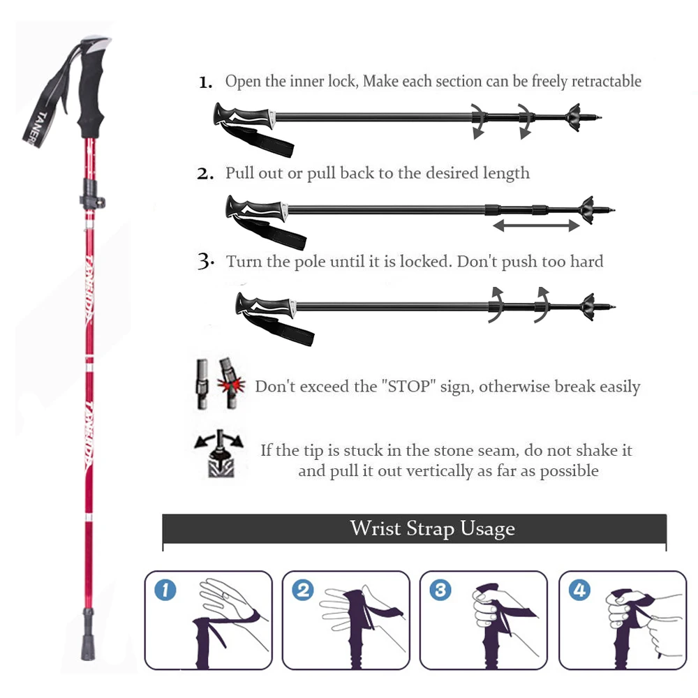 1. Открыть Внутренний замок, сделать каждый раздел может быть свободно выдвижной 2. Вытяните или потяните назад к желаемой длине 3. Поверните полюс до тех пор, пока он не будет сложен. Не нажимайте слишком сильно PS: Не превышайте знак «стоп», в противном случае легко ломается. Если наконечник застревает в каменном шве, Не трясите его и вытяните его вертикально, насколько это возможно