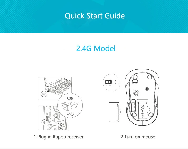 Модель 2,4G 1. Подключите приемник Rapoo. 2. Включите мышь. Модель Bluetooth О: сопряжение первого устройства A1.включите мышь A2.удерживайте нажатие кнопки Bluetooth не менее 3 секунд для сопряжения. Светодиодный индикатор состояния медленно мигает красным. Мышь обнаруживается в течение 2 минут. A3.полное соединение Bluetooth на вашем устройстве: Windows 7 и 8: (1) Нажмите кнопку «Пуск», затем выберите Панель управления> Добавить устройство. (2) выберите «Rapoo BT3.0 Mouse» или «Rapoo Ble Mouse» из списка, затем нажмите next. Windows 10: (1) Нажмите кнопку «Пуск», затем выберите Настройки> устройства> Bluetooth. (2) выберите «Rapoo BT3.0 Mouse» или «Rapoo Ble Mouse» из списка, затем нажмите Pair. B: сопряжение второго устройства B1.нажмите кнопку Bluetooth, чтобы переключиться на другой канал. B2.выполните шаг a2 и a3 «сопряжение первого устройства» для подключения второго устройства. Состояние светодиодный: Когда вы берете мышь Если красный светильник станет стабильным в течение 6 секунд, устройство bluetooth 1 сопряжено. Если красный светильник медленно мигает, устройство bluetooth 2 сопряжено. Если светильник выключен, 2,4 ГГц устройство работает в паре. Переключение между парными устройствами Нажмите кнопку Bluetooth, чтобы переключиться на 3 сопряженных устройства (Подключение с погрешностью в пределах 2-х устройства через Bluetooth и 1 через 2,4 GHz приемник) Низкая батарея Красный светильник мигает дважды каждые две секунды при использовании мыши. Системные требования Windows XP/Visa/7/8/10 или более поздняя версия, usb-порт Гарантия Устройство имеет ограниченную гарантию на один год с момента покупки.