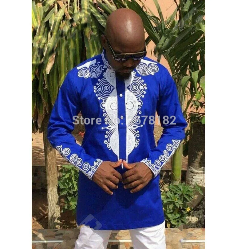 Для взрослых мужчин африканская синяя хлопковая одежда полированная Дашики печать длинная пуговица для пуловера рубашка наряд стоячий воротник Топ для мужчин размера плюс