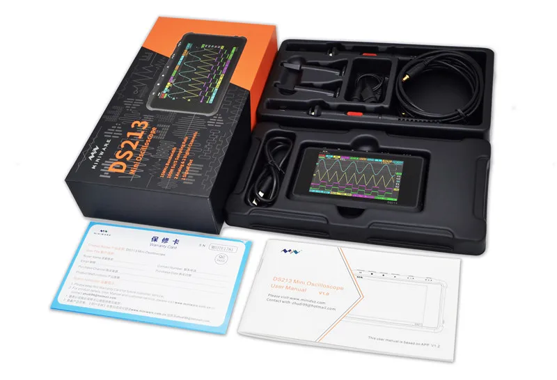 1 x DS213 Digital Oscilloscope 1 x X10 Probe 1 x X1 Probe 1 x USB Cable 1 x Screw driver 1 x Cover Bag 1 x User Manual