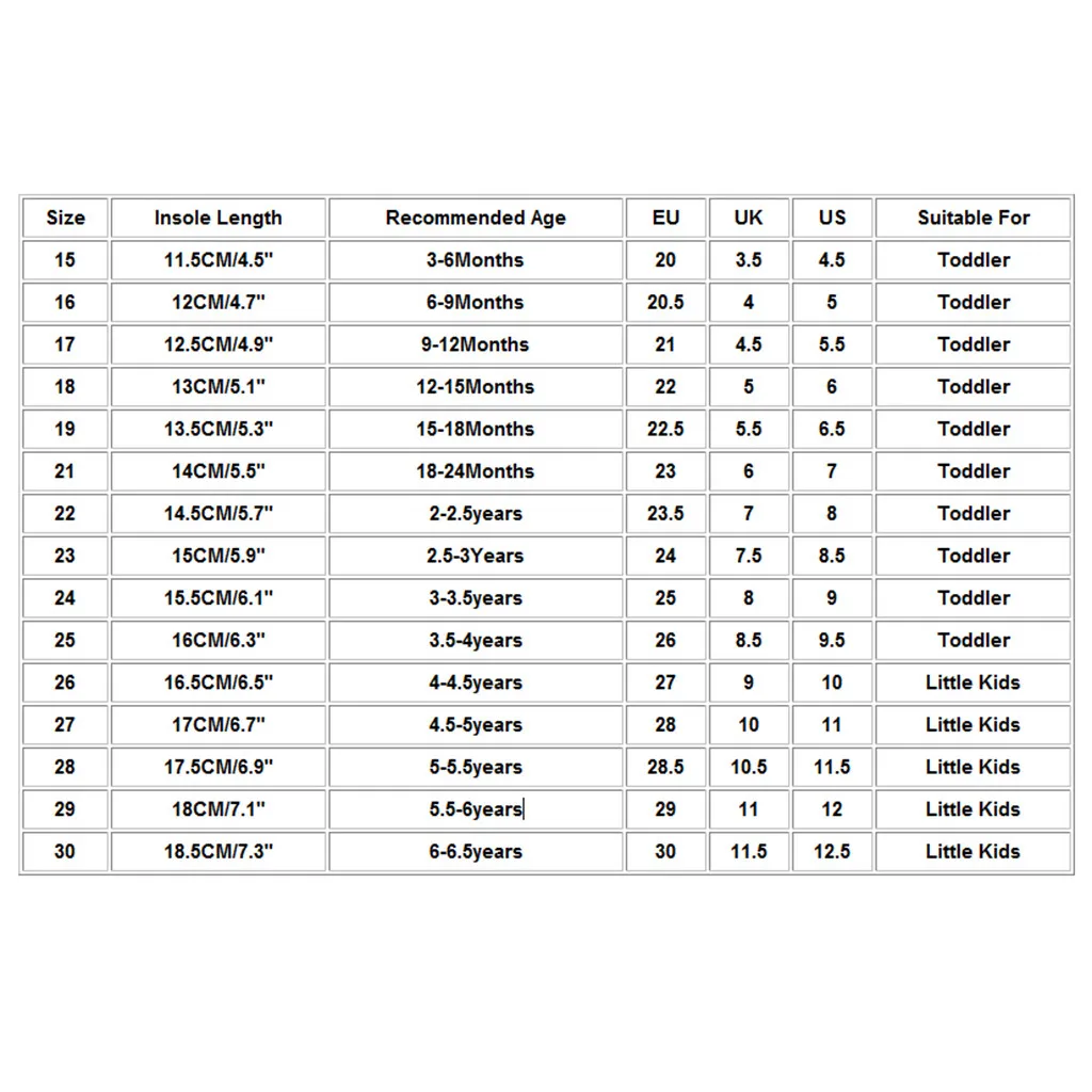 Размер Длина стельки Рекомендуемый возраст ЕС Великобритания США Подходит для 15 11,5 см/4,5 дюйма От 3 до 6 месяцев 20 3,5 4,5 Для малышей 16 12 см/4,7 дюйма От 6 до 9 месяцев 20,5 4 5 Для малышей 17 12,5 см/4,9 дюйма 9 to 12months 21 4,5 5,5 Для малышей 18 13 см/5,1" 12-15 месяцев 22 5 6 Для малышей 19 13,5 см/5,3 дюйма 15-18 месяцев 22,5 5,5 6,5 Для малышей 21 14 см/5,5 дюйма 18-24 месяцев 23 6 7 Для малышей 22 14,5 см/5,7 дюйма 2-2-5 лет 23,5 7 8 Для малышей 23 15 см/5,9 дюйма 2,5-3 года 24 7,5 8,5 Для малышей 24 15,5 см/6,1 дюйма 3-3,5 года 25 8 9 Для малышей 25 16 см/6,3 дюйма 3,5-4 года 26 8,5 9,5 Для малышей 26 16,5 см/6,5 дюйма 4-4,5 года 27 9 10 Маленькие дети 27 17 см/6,7" 4,5-5 лет 28 10 11 Маленькие дети 28 17,5 см/6,9 дюйма 5-5 лет 28,5 10,5 11,5 Маленькие дети 29 18 см/7,1" 5,5-6 лет 29 11 12 Маленькие дети 30 18,5 см/7,3 дюйма 6-6-5 лет 30 11,5 12,5 Маленькие дети