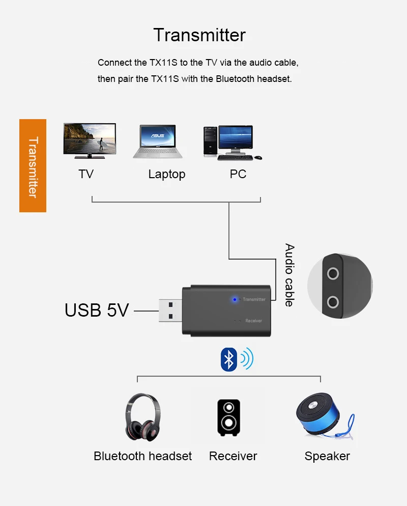 1. TX11S может передавать по беспроводной сети звук телевизора компьютера ноутбука ТВ-приставка MP3 на Bluetooth приемные устройства, такие как: bluetooth-гарнитура, популярная звуковая панель, bluetooth-динамик, традиционный усилитель мощности (требуется bluetooth-приемник): экономит проблемы с проводкой для клиентов, с размещением динамика TX11S, Его можно разместить в соответствии с предпочтениями пользователя. Идеальный звук может быть достигнут без привязки линии. Не только это, но и подходит для ночных сов в определенных ситуациях, таких как просмотр Кубка мира, ночная драма и т. д. Вы должны взять с собой bluetooth-гарнитуру, чтобы посмотреть ее самостоятельно, это не повлияет на остальных членов вашей семьи.