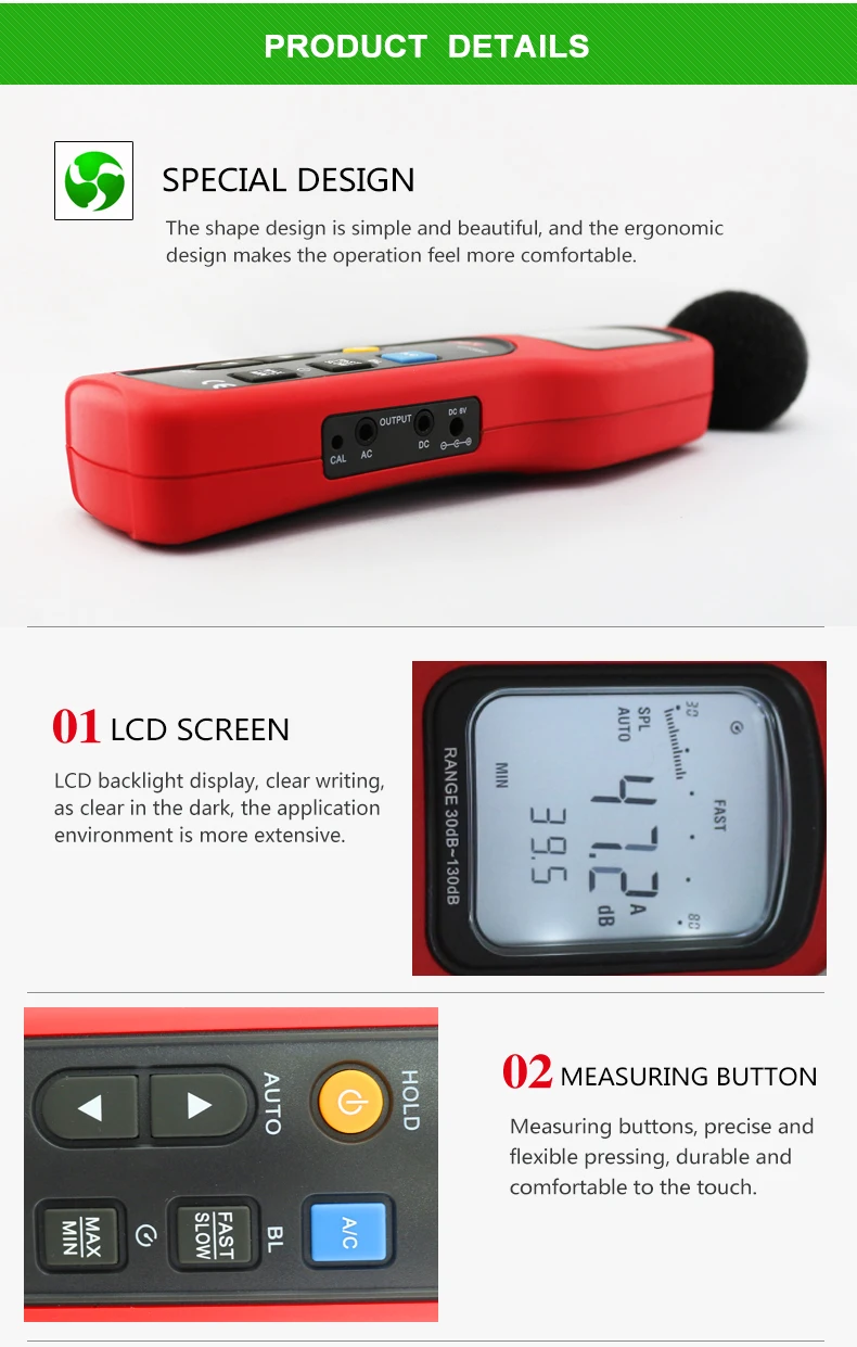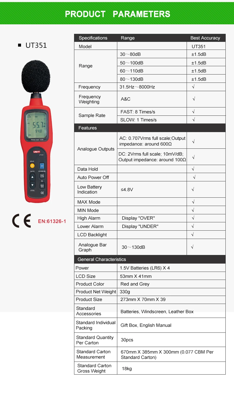 Измеритель уровня звука серии UT350 может измерять уровень звукового шума и выводить результаты в режимах d B.A или C, которые могут быть выбраны в зависимости от приложения. Эти счетчики потребляют очень мало энергии и могут непрерывно работать до 20 часов. Они подходят для промышленных и экологических измерений уровня звука