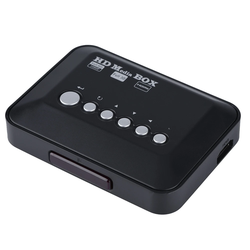 Specifications: Material: ABS+ Metal Color: Black Standard: VDE, USS (optional) Readable: SD/MMC/MS Support Hard Disk Format: FAT16 / FAT32 / NTFS USB Host Function: External access to mobile memory, such as MP3,MP4, USB drive, mobile hard drive, support equipment hot plug and pull. Output Interface: AV composite video, color output PrPbY, left and right channel, HDMI HD interface Power supply: AC 100-240V 50/60Hz input; DC 5.4V /2A output (power mark 5V/2A is actually 5.4V /2A) Limit Temperature: - 5 °C - 50 °C TV Format: PAL/NTSC Video Output: 1.0 ± 0.2Vp-p, 75 Ω Audio output: 2.0 ± 0.2V (RMS) SNR: ≥80dB Power Supply Mode: external adapter, 5V power access Storage Media: There is a USB HOST interface, which can connect USB hard disk and USB disk.It is very convenient to replace the storage equipment. Support Video Decoding: H.263, H.264, VC-1, Mpeg1/2/4-HD, Xvid, WMV, RV Support Video Format: MKV, AVI, TS/TP, M2TS, RM/RMVB, MOV, VOB, FLV, WMV Support Audio Coding: DTS, AC3, FLAC, AAC Support Audio Format: MP3, OGG, WMA, APE Support Image Format: JPEG, GIF, PNG, BMP format Video Output Terminal: HDMI1.3 interface, AV composite video output interface Audio Output Terminal: Stereo left and right analog audio channel output Storage Extension Terminal: Support SD/MMC two-in-one interface, support SDHC high speed card. Support Subtitle Format: ass ssa sub Remote Control Battery Type: 2*AAA battery (not include) Size: Approx. 11 * 8 * 2.5 cm / 4.3 * 3.1 * 1 in Weight: 347 g gross weight; The net weight of 81.5 g