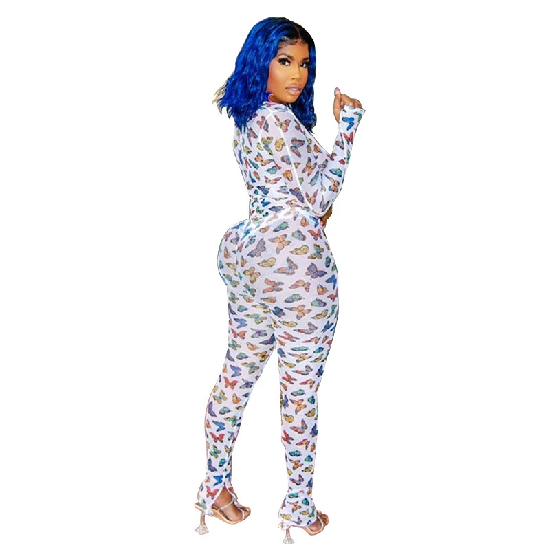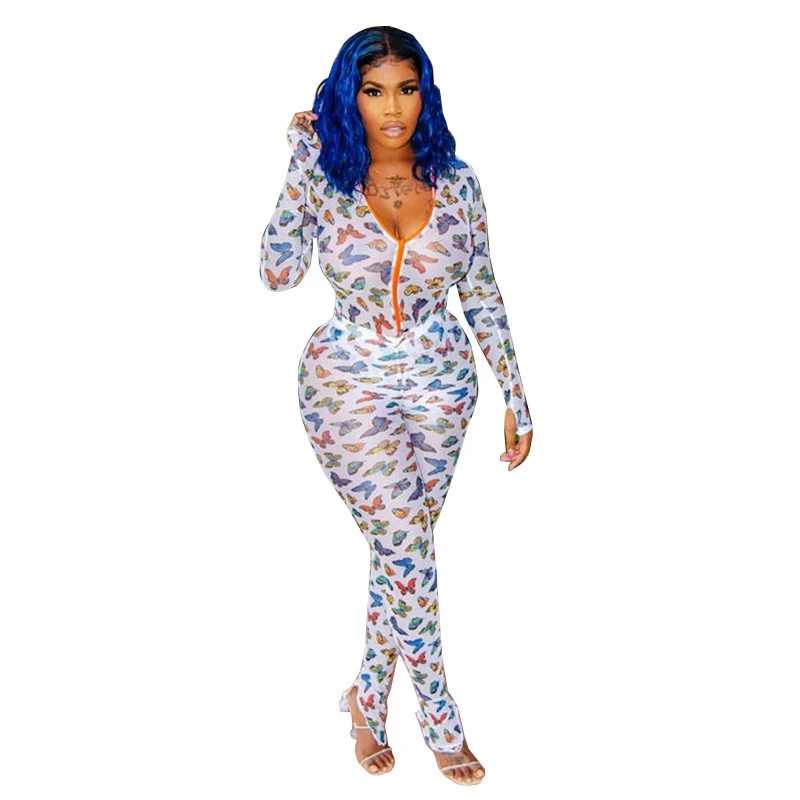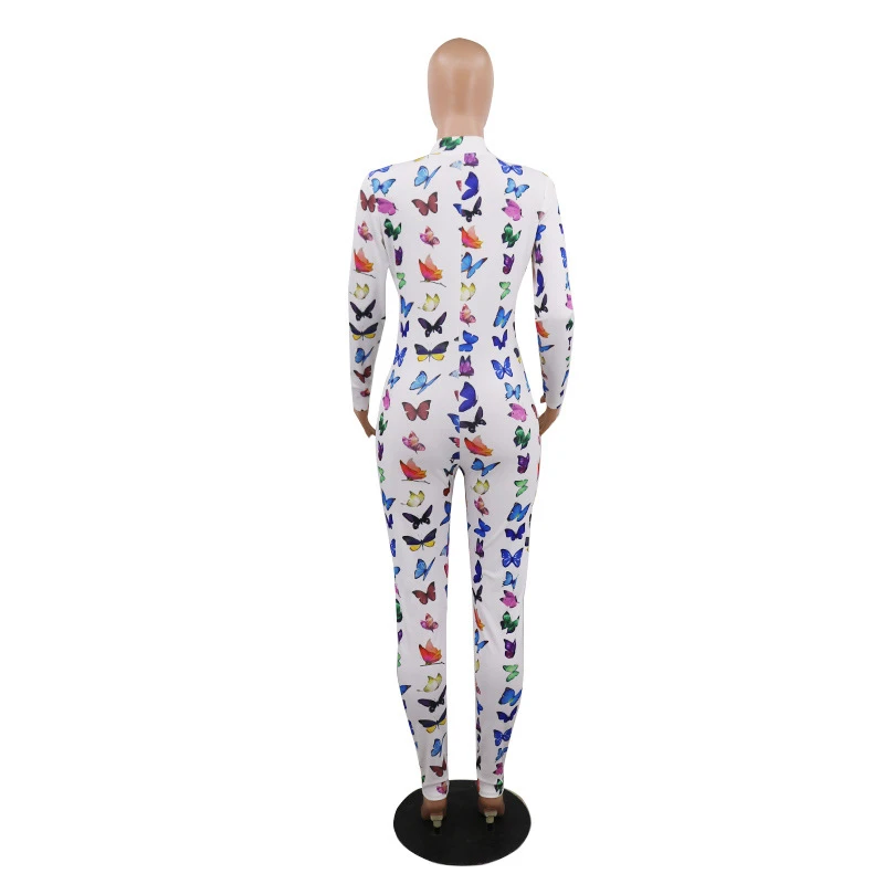 Adogirl Colorful Butterfly Print Women Jumpsuit Front Zipper V Neck Long Sleeve Skinny Romper Plus Size S-XXL Tracksuit Overalls