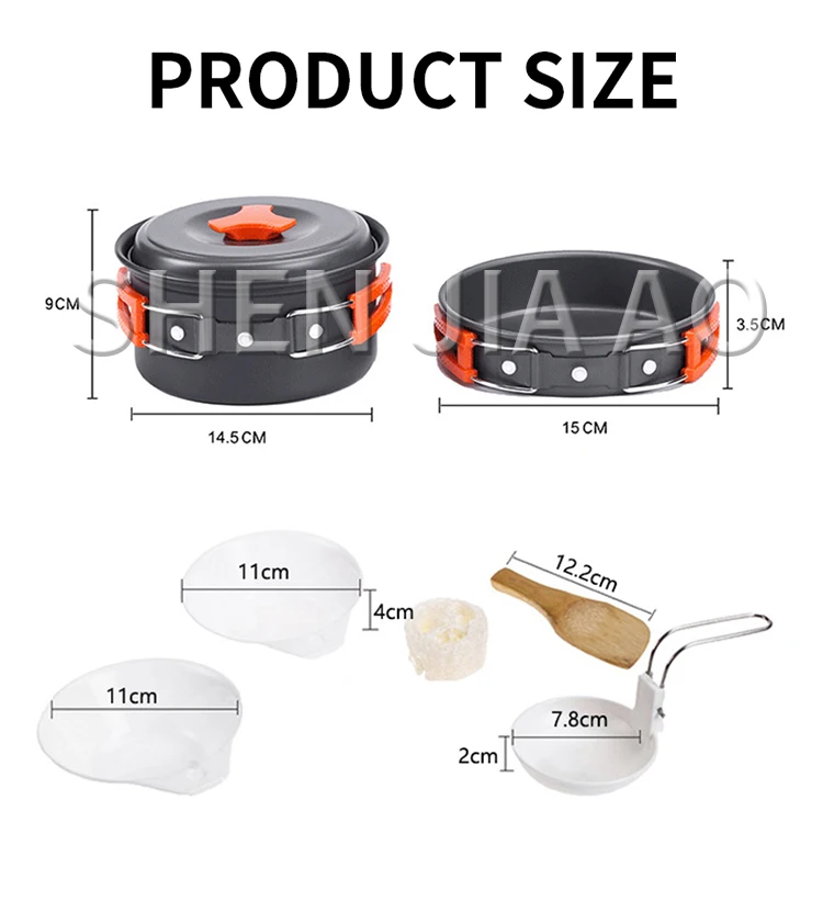Кастрюля для приготовления пищи: 1 шт., φ14.5*7 см Сковорода: 1 шт, φ15*3,5 см, ручка 10 см Миски: 2 шт, 1111 см * 4 см Деревянная Лопата: 1 шт, 12-5 см Ложки: 1, 16 см в длину, 7,8 см в диаметре, 2 см в глубину Вес: 480 г Упаковка: белая коробка + тканевый мешок Размер упаковки: 16*9,2*16 см Материал: алюминий, высокопрочный пластик Особенности: высокая термостойкость, износостойкость, высокая твердость материала