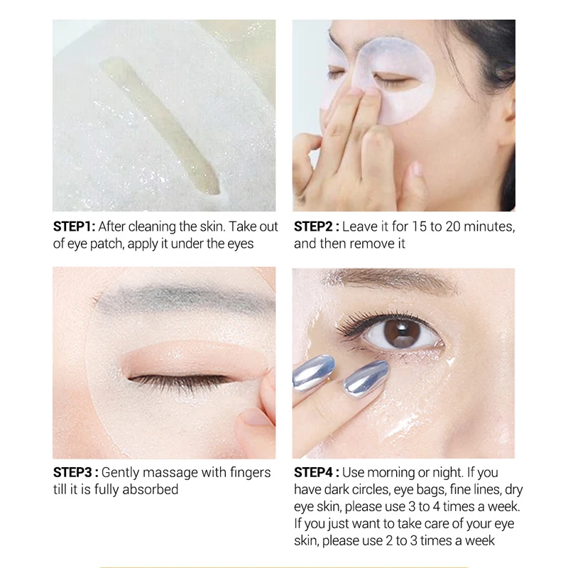 Способ применения: 1. После очищения лица Используйте лосьон, чтобы успокоить вашу кожу. 2. Выньте один лист маски для глаз пинцетом и нанесите на зону вокруг глаз. Вы будете чувствовать себя круто. 3. Маска для глаз также может быть использована на других сухих частях на лице или вокруг носогубных складок. Ваши проблемы с кожей могут быть эффективно уменьшены. 4. Удалите маску для глаз, когда она станет тоньше через 15-20 минут. Она может хорошо впитываться кожей.