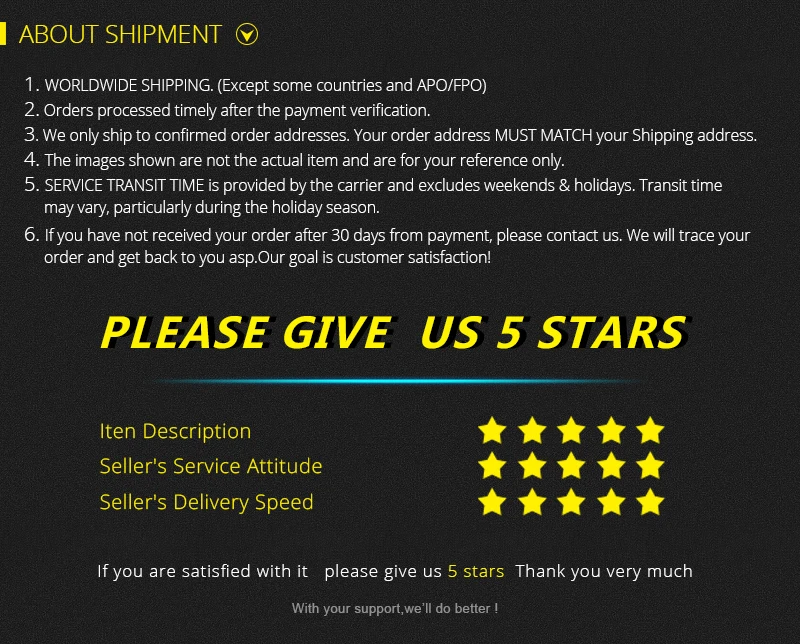 Когда вы получили наш продукт, если это имеет какие-либо проблемы. Вы можете сразу связаться с нами без колебаний, прежде чем оставить нам отзыв. Мы ответим вам и решим вашу проблему в ближайшее время.