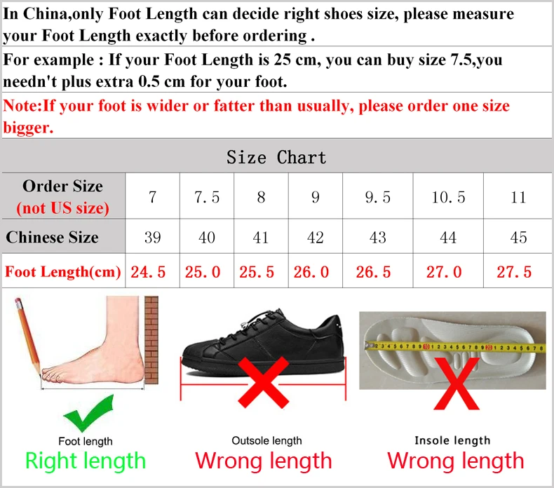 1. Мы не американские размеры. Мы не европейские размеры. В Китае только длина стопы определяет правильные размеры. Не измеряйте длину подошвы. Не измеряйте длину стельки. Пожалуйста, измерьте длину вашей стопы, а затем выберите размер в соответствии с нашей таблицей размеров. 2. Если вы чувствуете неприятный запах, это нормально, потому что новая обувь может иметь запах клея. 3. Фотография может отличаться от реальной обуви, фотография может быть яркой, настоящая обувь может быть темной. 4. Мы упаковываем обувь в пенопластовую сумку, а не коробку, поэтому обувь может немного помяться после получения.