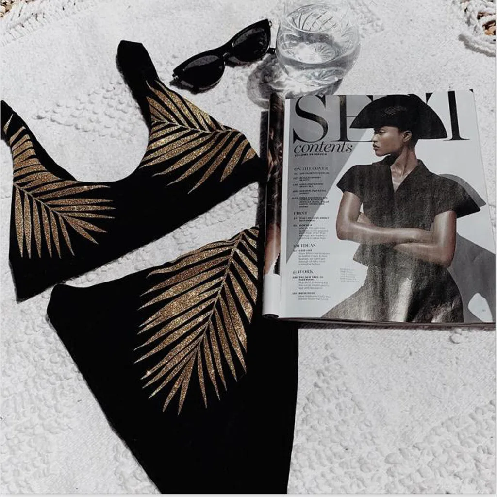 Женский бикини с принтом золотого листа, сексуальный однотонный купальник с принтом пуш-ап, уплотненный бюстгальтер, Пляжное бикини, купальник, набор, купалник 40 *
