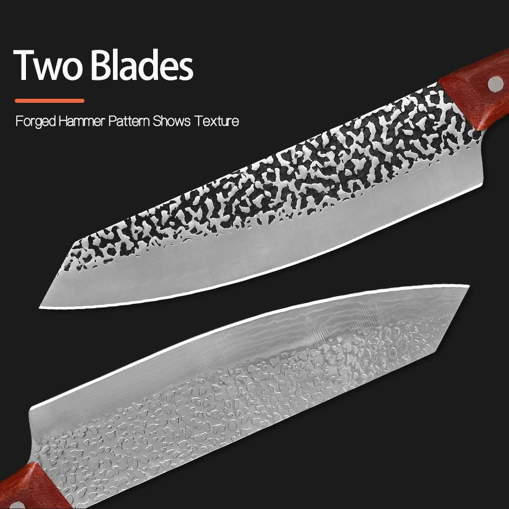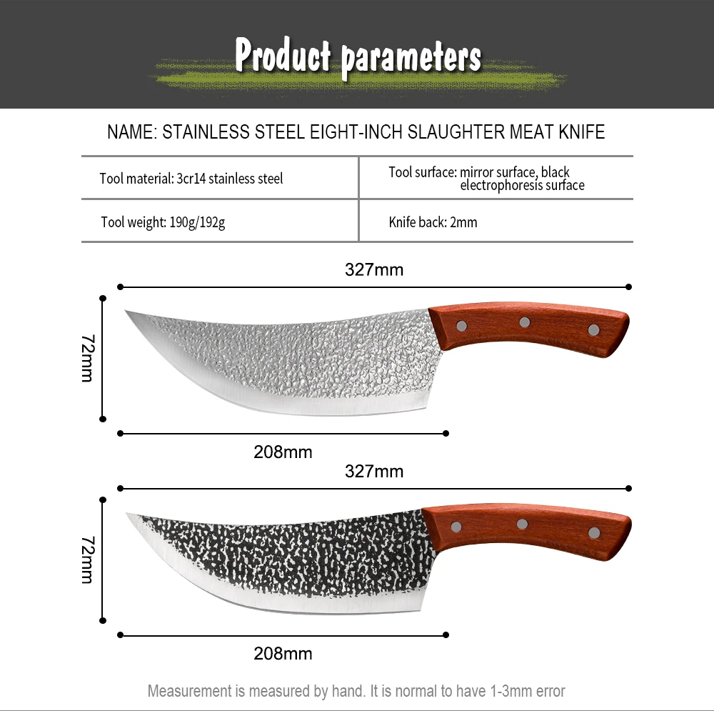 Ножи Особенности: Материал: марганца Сталь Закалка всплеск: 780 градусов Температура: 180 градусов-200 градусов Материал: Кованая Высокоуглеродистая сталь ручной работы Характеристики: бритва острая для легкой резки костей Ручка: полностью интегрированный Стальной хвостовик + дерево + заклепки Производственный процесс: в закалки-закалки молота-закалки-зажима стали-молота-закалки и других операций непрерывного цикла.