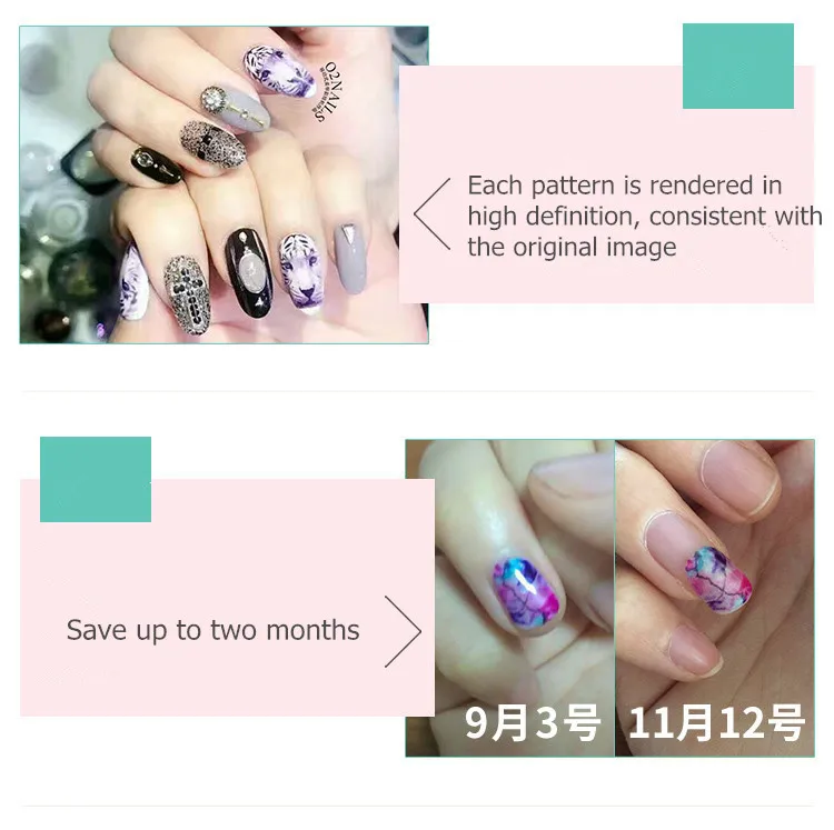 1. Нанесите грунтовку на ногти 2. Нанесите клей PG на ногти 3. Печать узоров с O2NAILS принтер для ногтей 4. Добавьте украшения или уплотнения по мере необходимости