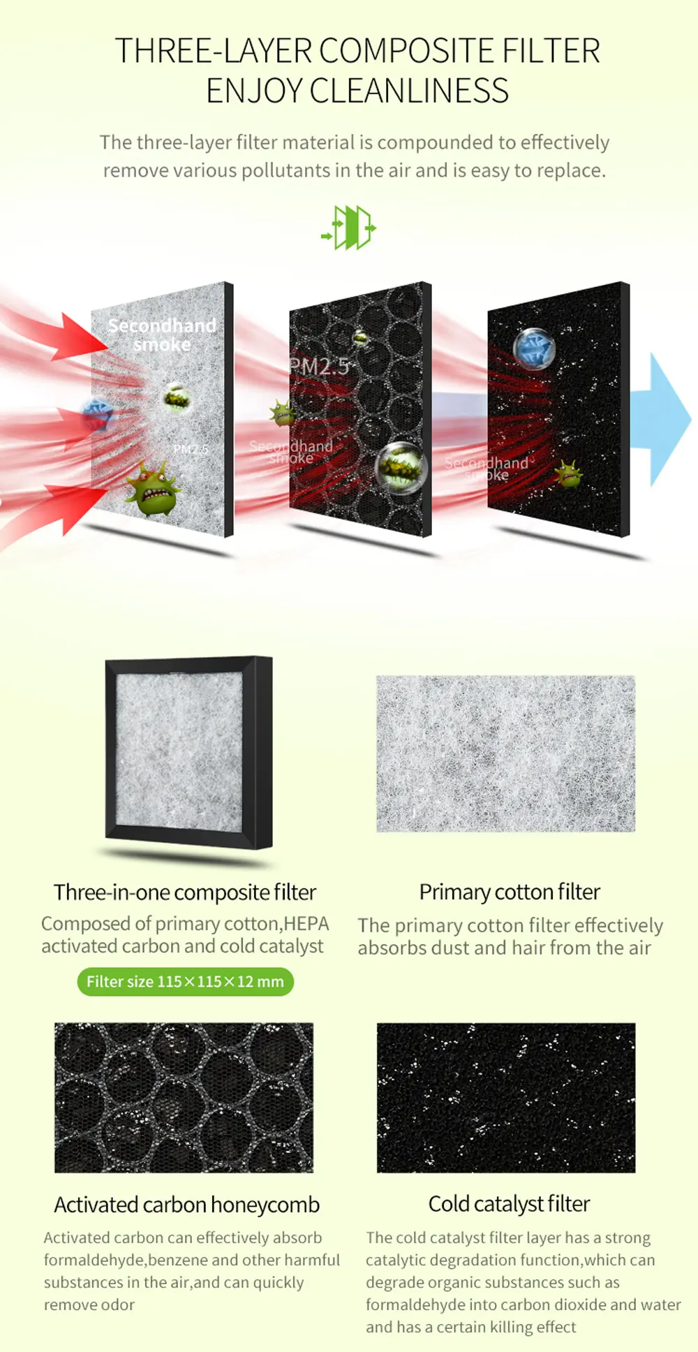 Трехслойный фильтрующий материал усиливается для эффективного удаления различных загрязняющих веществ в воздухе и легко заменяется. 1. Три-в-одном Композитный фильтр Состоит из первичного хлопка, HEPA активированного угля и холодного катализатора Размер фильтра: 115*115*12 мм 2. Основной хлопковый фильтр Основной хлопковый фильтр эффективно поглощает пыль и волосы из воздуха 3. Ячеистая сеть с активированным углем Активированный уголь может эффективно поглощать формальдегид, бензол и другие вредные вещества в воздухе. И может быстро удалить запах. 4. Фильтр холодного катализатора Фильтрующий слой холодного катализатора имеет сильную каталитическую функцию разложения, которая может привести к деформации органических веществ, таких как формальдегид в углекислый газ и воду и имеет определенный эффект уничтожения.