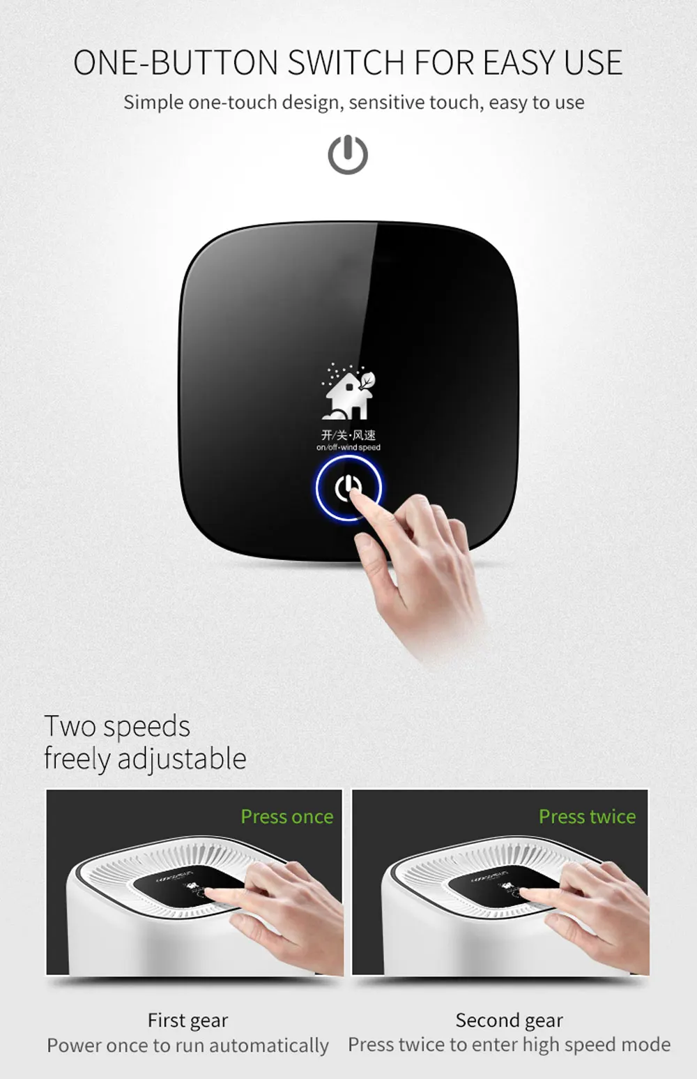 1. Простой дизайн с одним касанием, чувствительное прикосновение. Простой в использовании Две скорости свободно SDJUSTABLE 1. Первая передача: мощность один раз для запуска автоматически 2. Вторая передача: нажмите дважды, чтобы перейти в режим высокой скорости