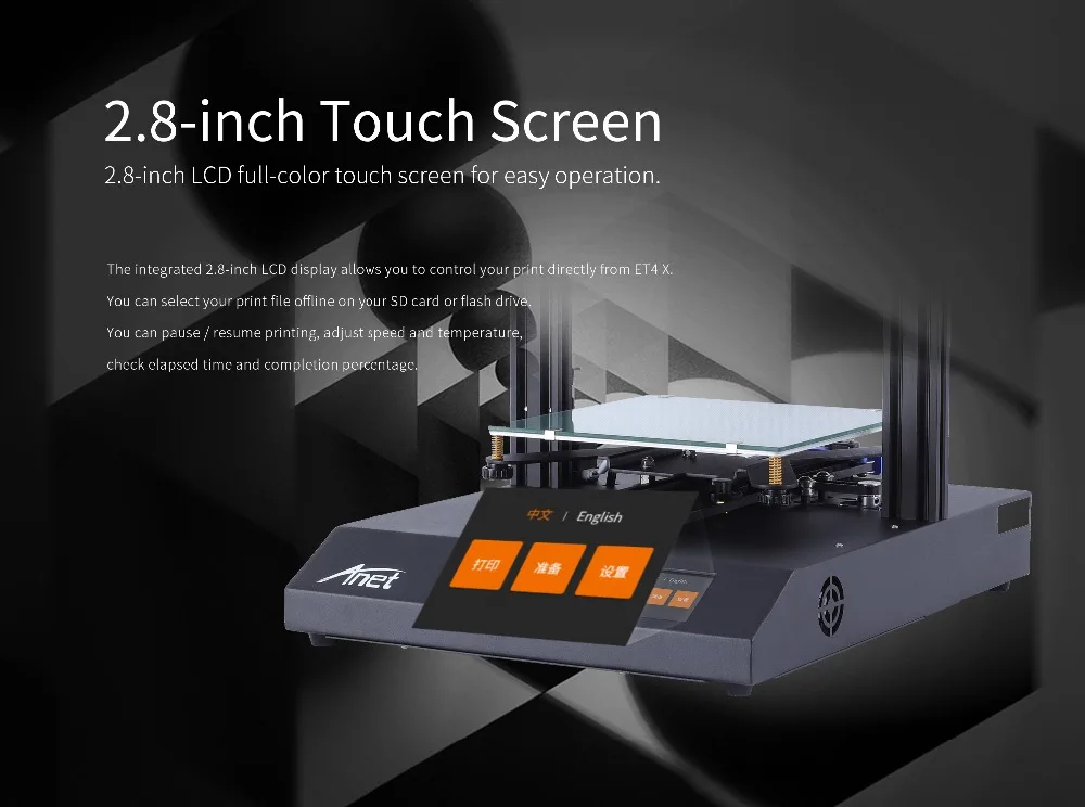 5. Комплексное 2,8-дюймовый ЖК-дисплей дисплей позволяет tocontrol ваши отпечатки напрямую от ET4X, вы можете выбрать вашу печать файлов в автономном режиме на sd-карте или флеш-драйвер. Вы можете приостановить/продолжить печать, настроить скорость и температуру, проверить истекшее время и процент завершения.