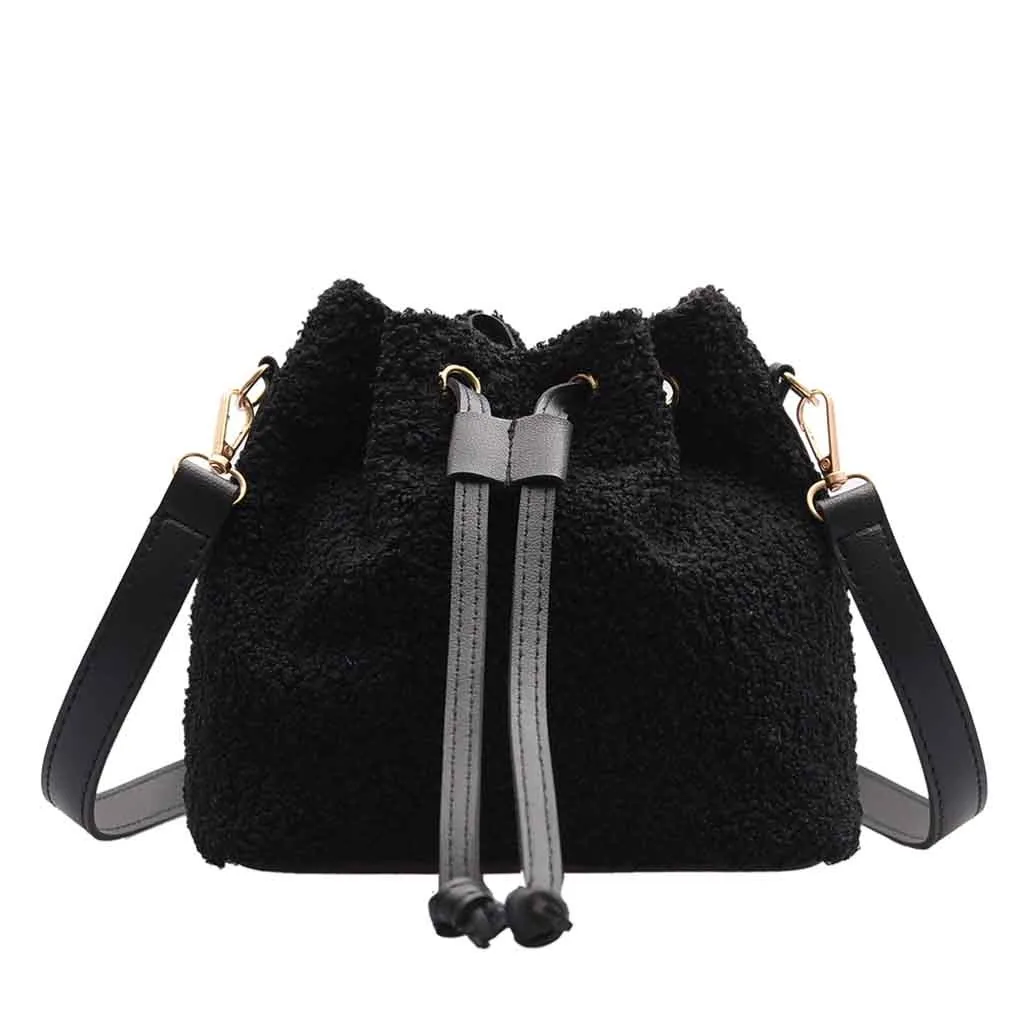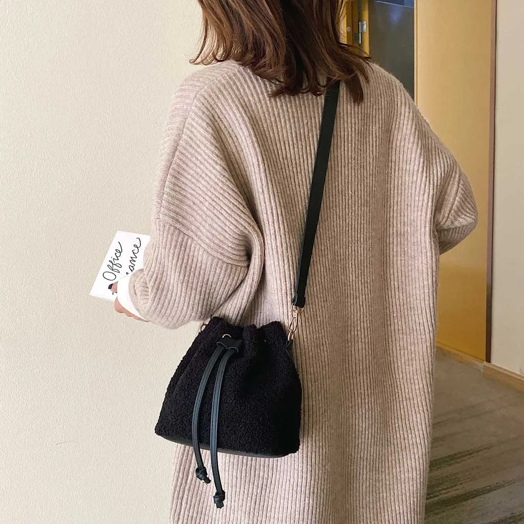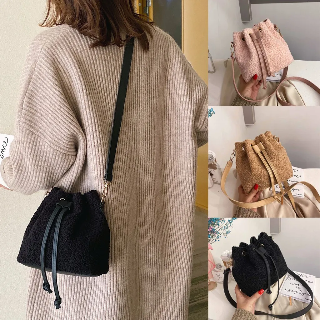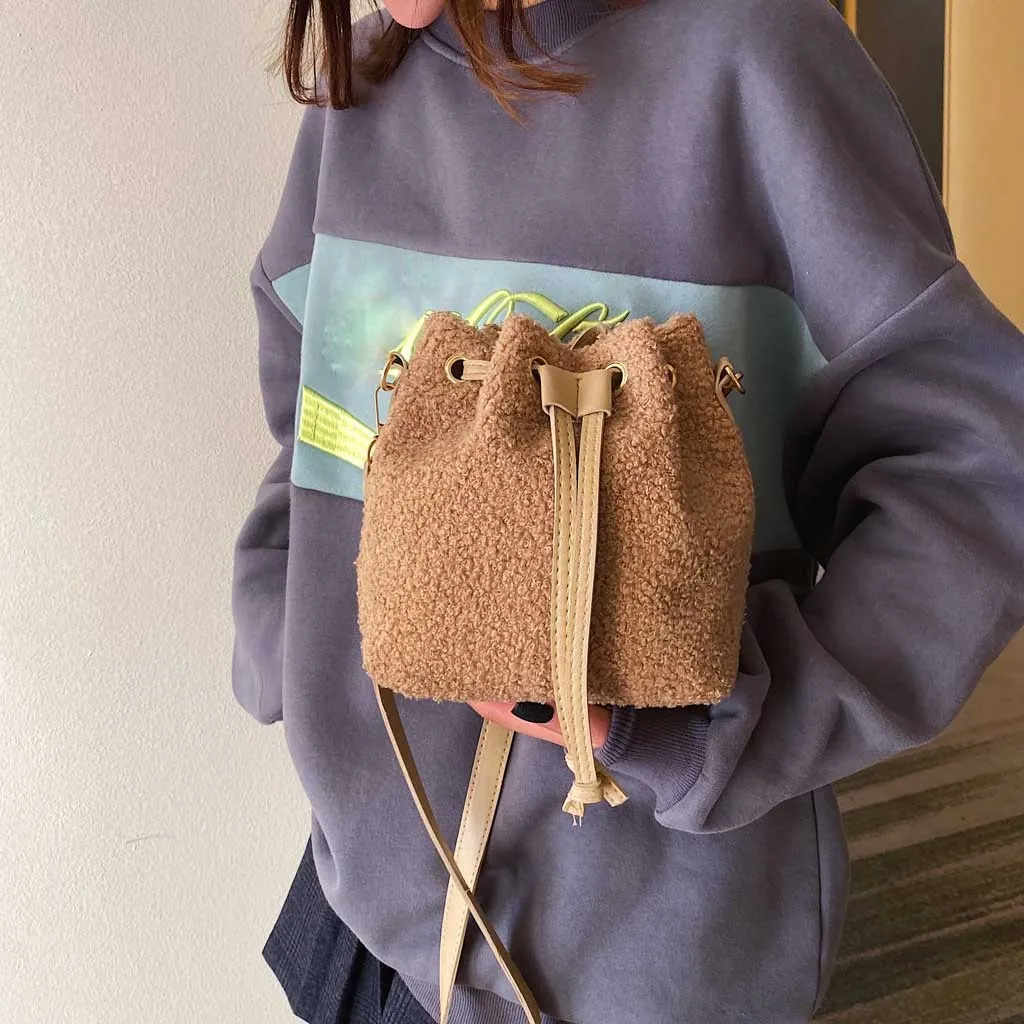 Ladies Bag Messenger Drawstring Casual Bag New Simple Woolen Shoulder Fashion Personality lattice Simple Wild Drawstring