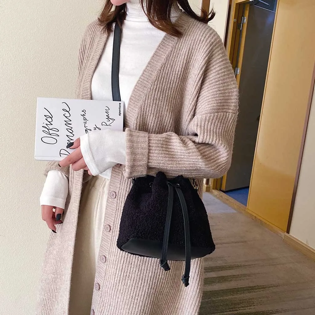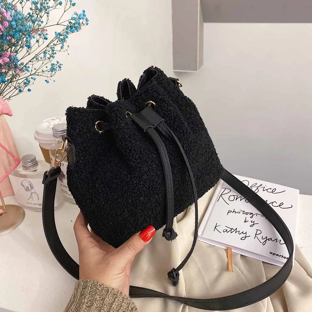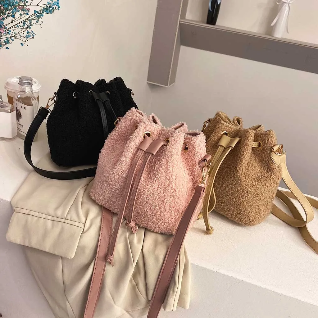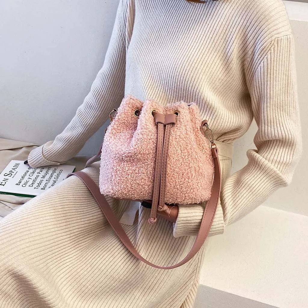 Ladies Bag Messenger Drawstring Casual Bag New Simple Woolen Shoulder Fashion Personality lattice Simple Wild Drawstring