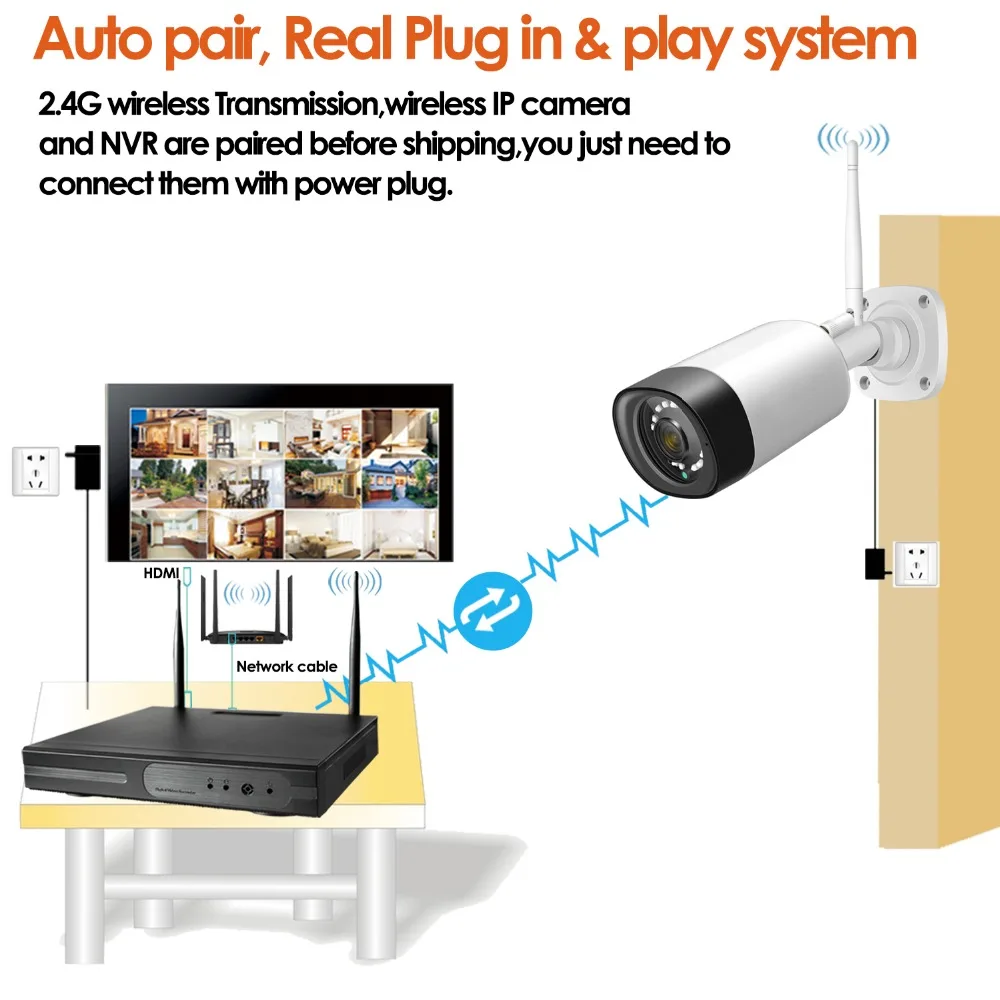 Подключи и работай. Это может быть очень легко для всех, чтобы настроить эту систему WIFI NVR без каких-либо проблем с установкой безопасности. Вы можете получить доступ к удаленному видео просмотра в реальном времени через ПК/мобильный телефон в любое время и в любом месте.