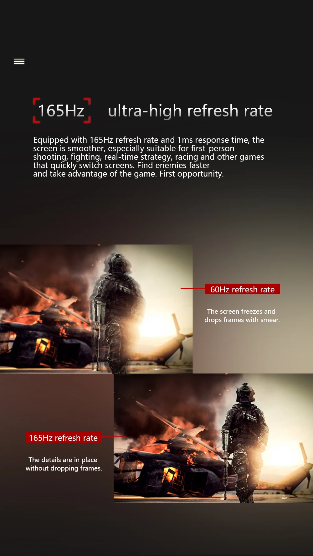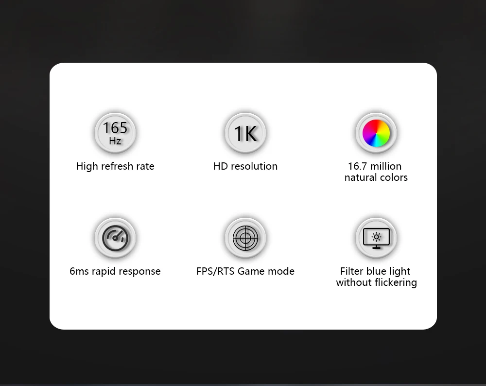 Частота обновления до 165 Гц: более чем в два раза превышает стандартную скорость обновления, 165 Гц дает геймерам преимущество в видимости, поскольку мгновенный переход кадров не оставляет размытых изображений