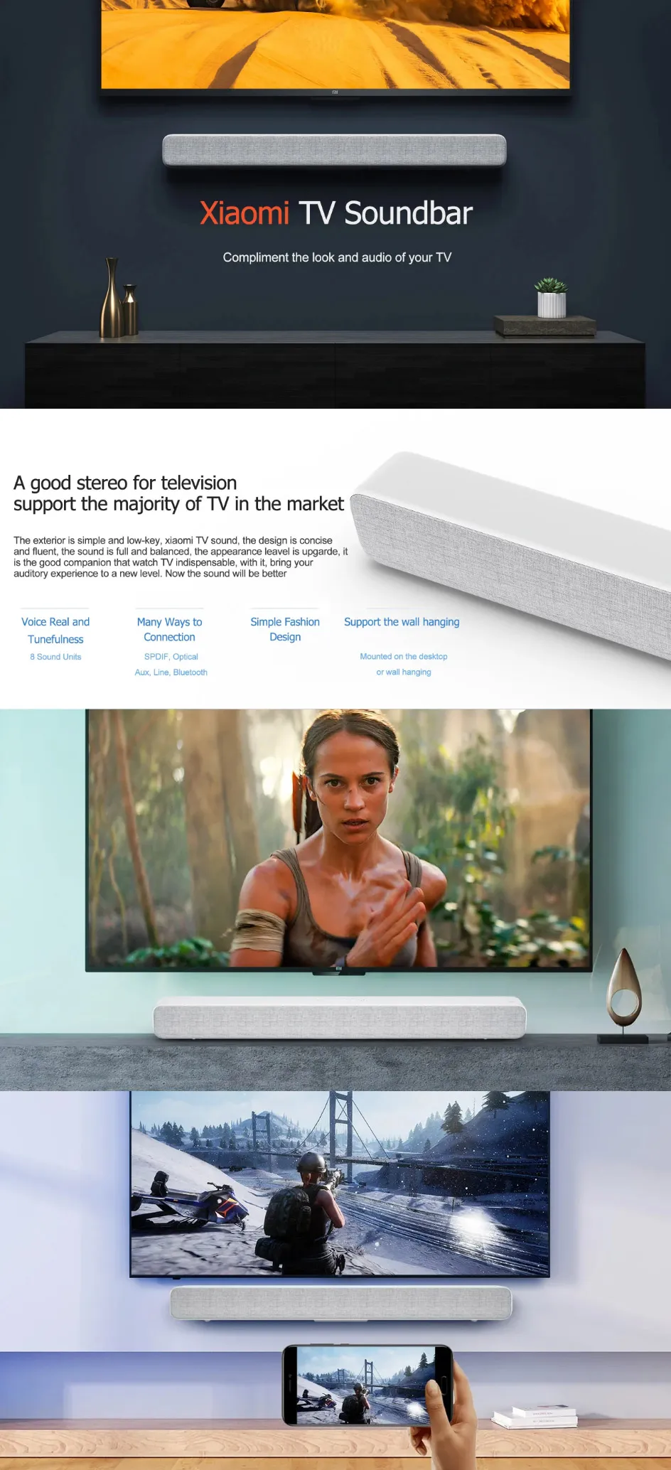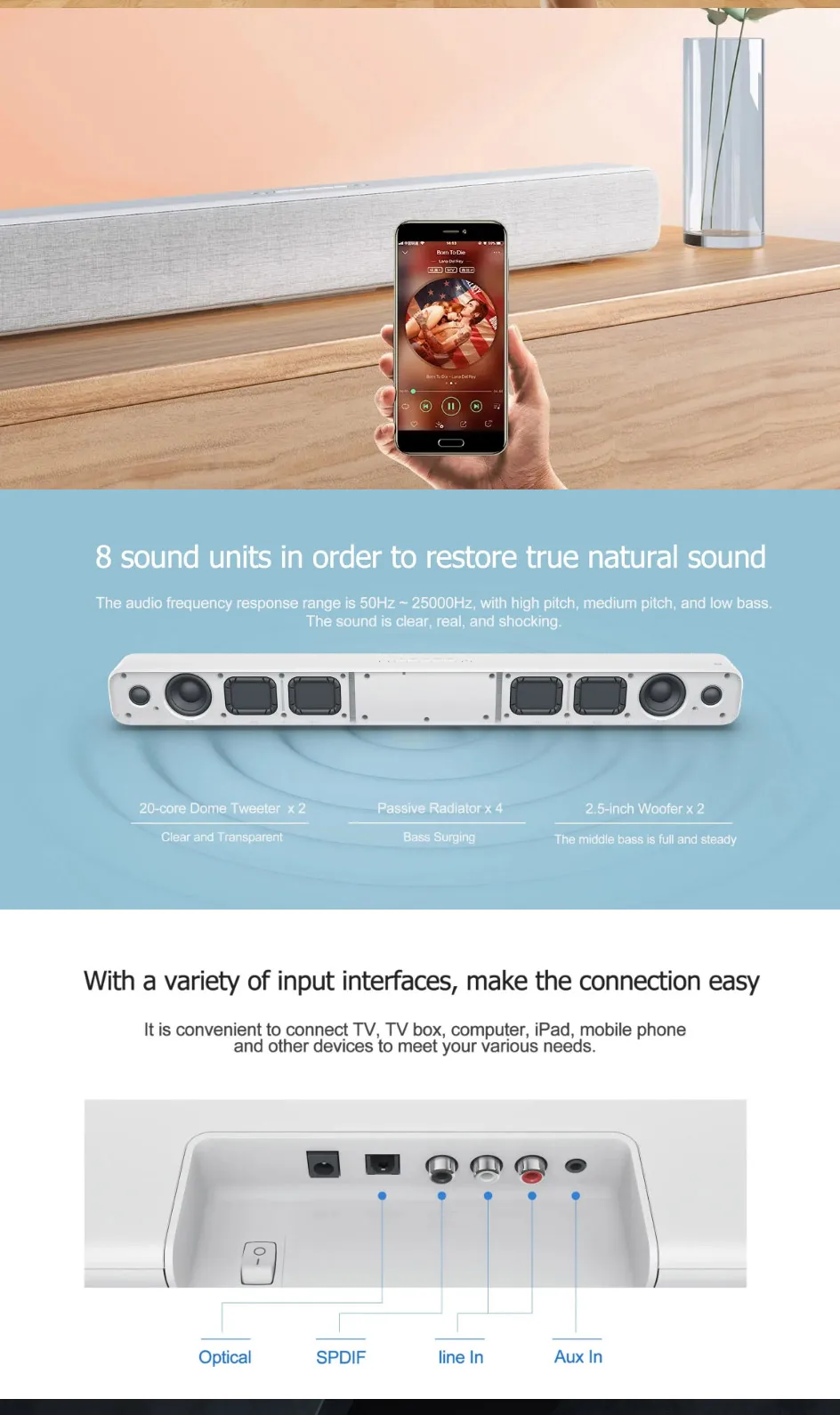 Bluetooth-динамик Xiaomi прямоугольной формы является высокопроизводительным искусственным динамиком. Он может слушать и говорить, как ваш настоящий друг. Этот динамик предназначен для телевизора и поддерживает большинство телевизоров на рынке. Это позволит вам почувствовать эффект кинотеатра дома. Кроме того, он поддерживает настенное крепление и крепление на сиденье. Вы можете выбрать в соответствии с вашей реальной ситуацией.