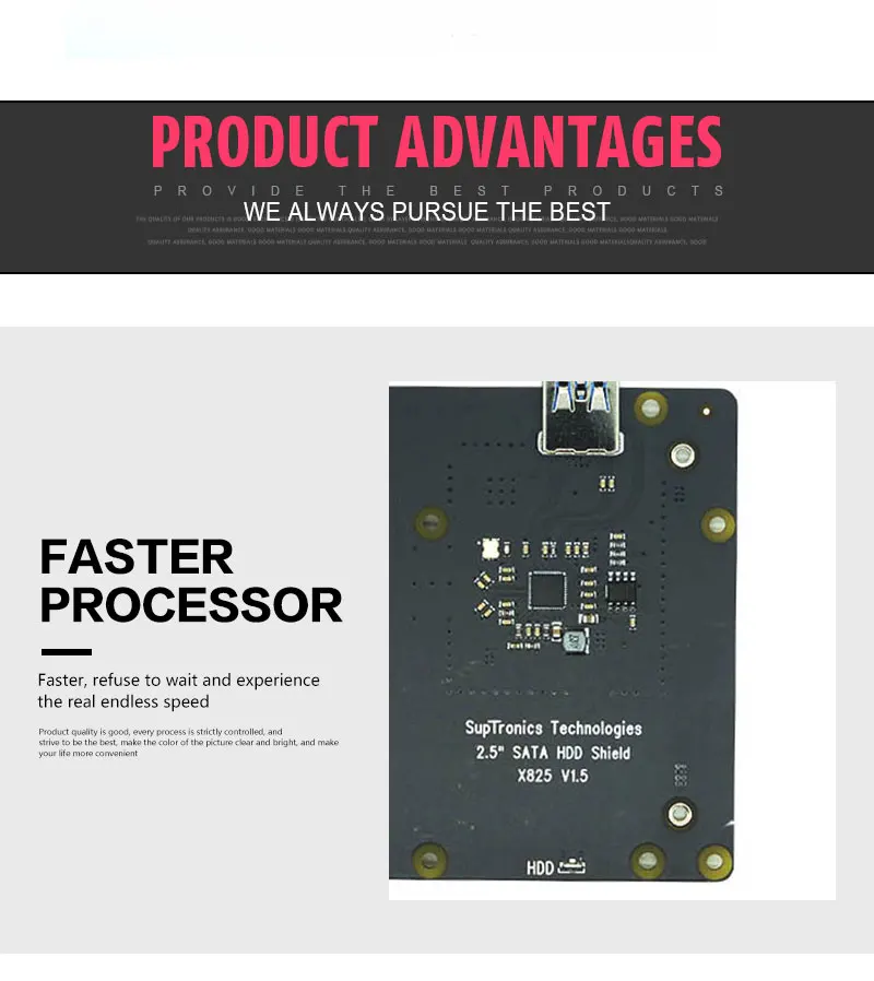 Описание продукта: X825 Raspberry Pi 4 Модель B 2,5 дюймов жесткого диска SATA HDD/SSD хранения плата расширения. Вы можете сделать свое собственное Облачное хранилище или частную систему хранения NAS у себя дома. Расширительная плата X825 обеспечивает полное решение для хранения для новейшей raspberry pi 4B. Он поддерживает до 4-х никель-металл-ТБ 2,5-жесткий диск SATA жесткий диск диски (HDD) /Твердотельный накопитель (SSD). Только 2,5 дюймов SATA интерфейс жесткого диска/SDD жесткий диск подходит для X825 доска. Обновлен до порта USB3.1 Gen1. X825 подходит только для модели Raspberry Pi 4 B! Продукт Особенности Легко собрать Совместимость с ОС: все операционные системы Raspberry Pi USB3.1 Gen1 Порты и разъёмы Поддерживает до 4 ТБ 2,5-жесткий диск SATA жесткий диск диски (HDD) /твердотельный накопитель (SSD) (теоретически он может работать с 6 ТБ или 8 ТБ, а также. Но на самом деле мы не тестируем плату X825 с жестким диском 6 ТБ или 8 ТБ, вы можете попробовать.) Идеальное решение для хранения Raspberry Pi 4 Model B Нажимная кнопка On-board для управления включением/выключением питания (нажмите-on, удерживайте кнопку нажатой ed, как правило, 2s-off) Питает Raspberry Pi через Pi 40-штыревой разъём Светодиодный индикатор красного цвета показывает состояние питания, синий индикатор показывает состояние диска USB 3,1 Gen1 SATA 6 ГБ/сек. мост контроллер Быстрая передача файлов с высокоскоростным подключением USB 3,1 с ПК или Mac Питание s Raspberry Pi-без дополнительной подачи питания для RPi 4 Питание требование Источник питания: 100 - 240 в перем. Тока, 50 / 60 Гц, 5 в пост. Тока, 4 а выход DC Мощность штекер Размеры: 5,5*2,5 мм Примечание: Пожалуйста, используйте Высококачественный блок питания постоянного тока 5 в 4 А. Низкое качество источника питания, возможно повреждение вашего 2,5 дюймов HDD/SSD. Посылка включает в себя 1 x X825 V1.2 Плата расширения 1 x разъем USB 3,1 1 х 2 Pin Мощность соединительный провод (кабель: 12 см/4,72 дюймов) 1 x Монтажный винт, посылка Пульт дистанционного управления Примечание: Не включайте компьютеры raspberry pi и 2,5 "SATA SSD. С отверстием для крепления Технические Поддержка Http://www.suptronics.com/miniPCkits/x825.html