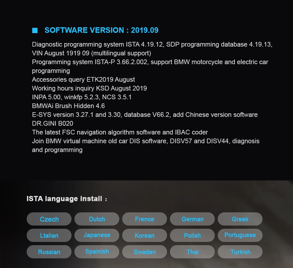 Диагностическая система программирования ISTA 4.21.31, база данных программирования SDP 4.21.32, многоязычная, vin-дата 14 января 2020 Система программирования ISTA-P 3.67.0.000, поддерживает программирование мотоциклов и электромобилей BMW Запрос запчастей ETK November 2019 Запрос часов KSD ноябрь 2019 INPA 5,00, winkfp 5.2.3, NCS 3.5.1 BMWAi кисть скрыть 4,6 E-SYS версии 3.27.1 и 3,30, база данных V67.0, китайская версия программного обеспечения DR.GINI B020 Новейший FSC навигационный код программного обеспечения и код IBAC Добавлен BMW Virtual Machine DIS software, DISV57 и DISV44, диагностика и программирование