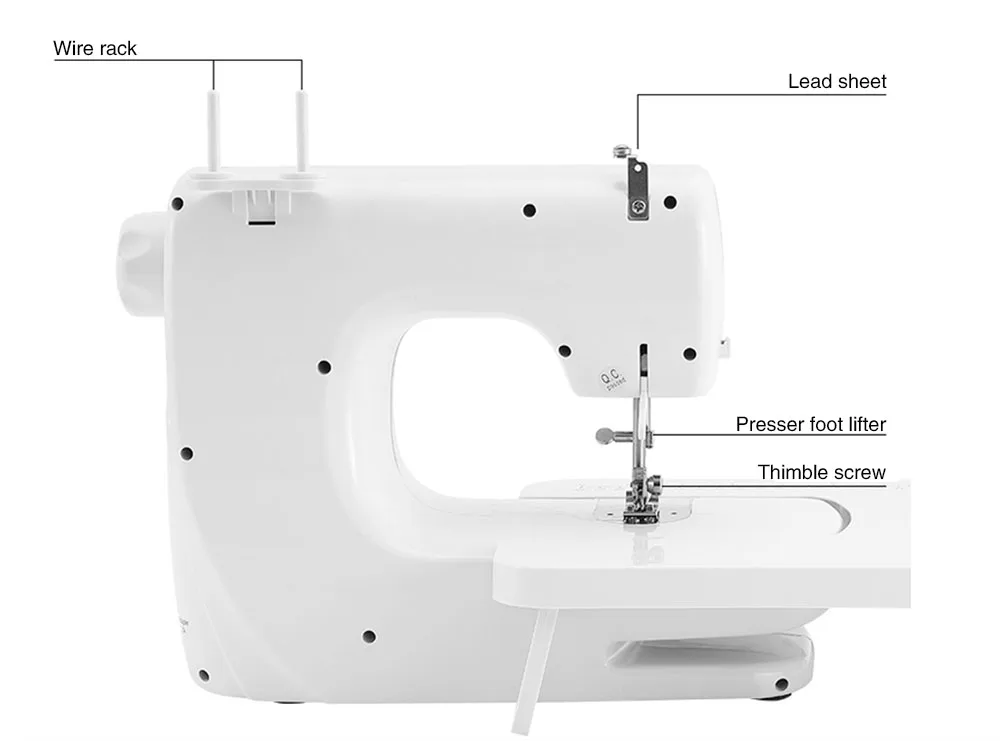 1x машина 2x резьбовые катушки 2x металлические катушки 1x иглы 1x Threader 1x педаль 1x адаптер переменного тока