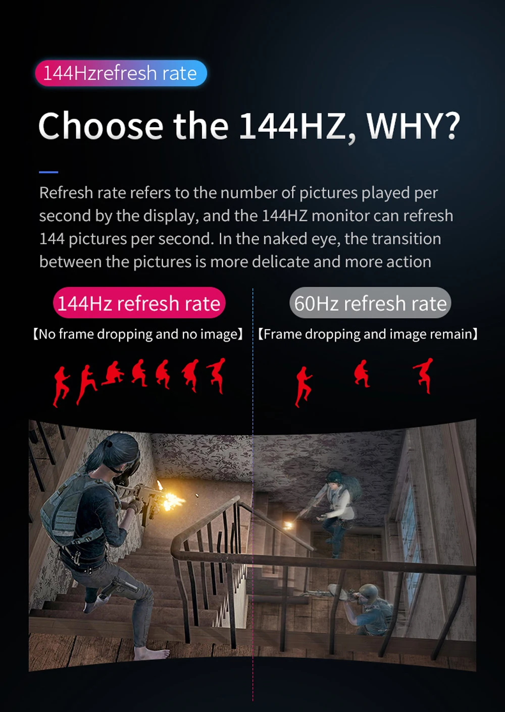 Частота обновления до 144 Гц: более чем в два раза превышает стандартную скорость обновления, 144 Гц дает геймерам грань видимости по мере мгновенного перехода кадров, не оставляя после себя размытых изображений