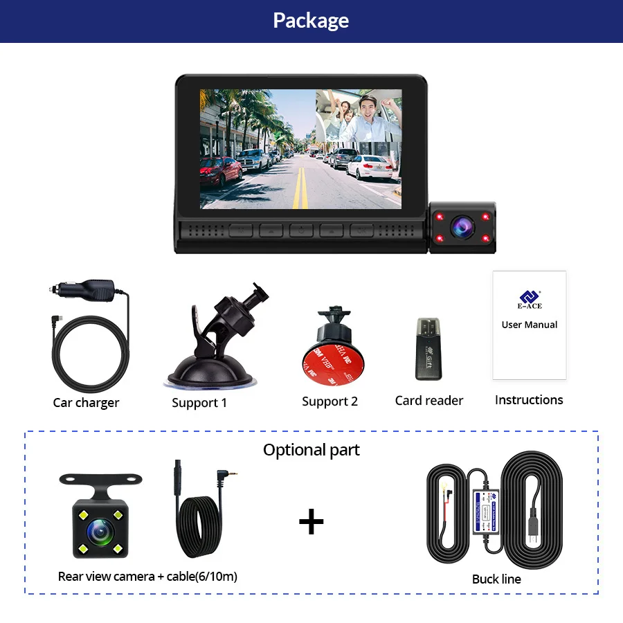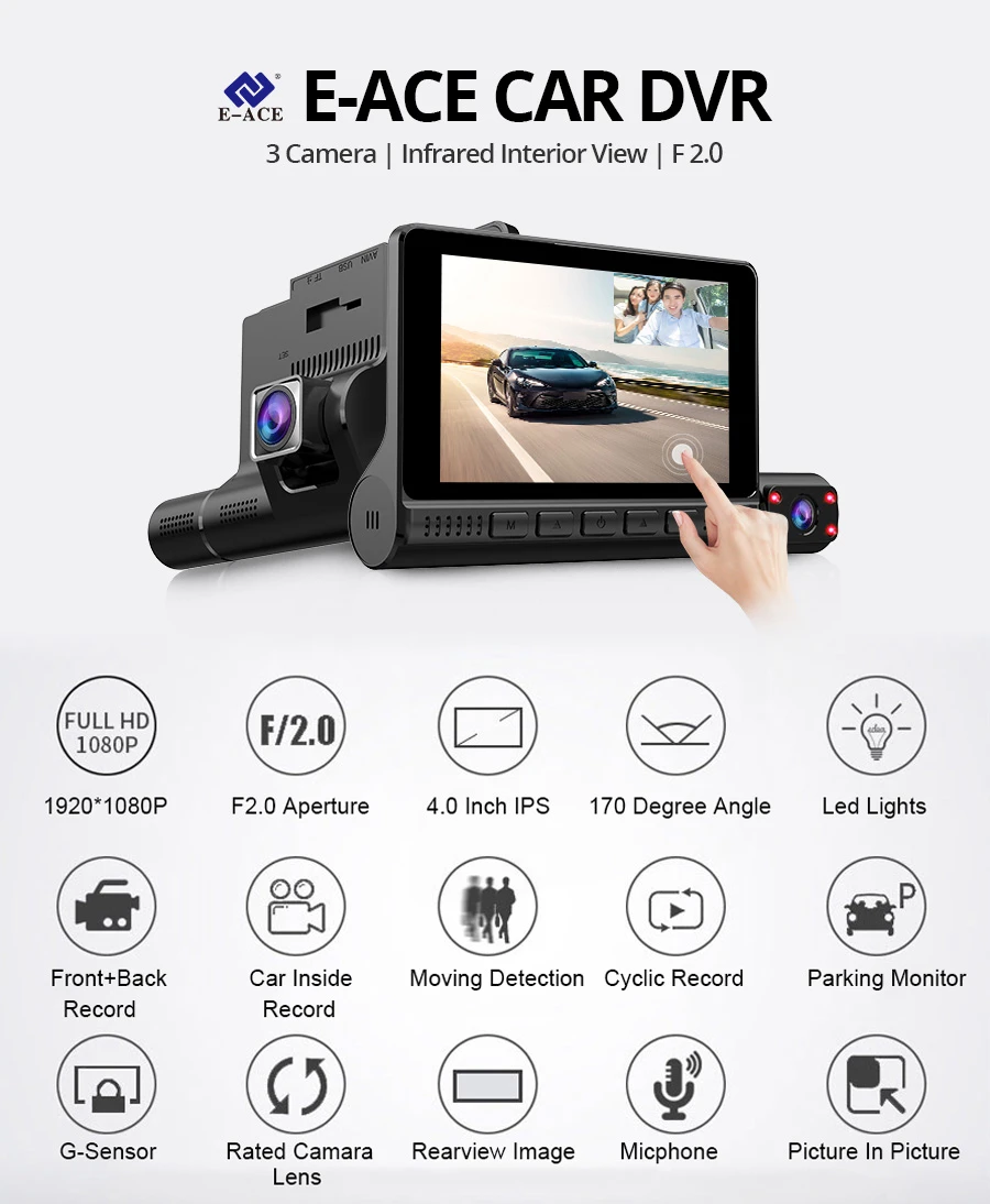 E-ACE видеорегистратор для автомобиля 4,0 дюйма сенсорный экран 3 камеры s объектив видеорегистратор с камерой заднего вида Автомобильный регистратор